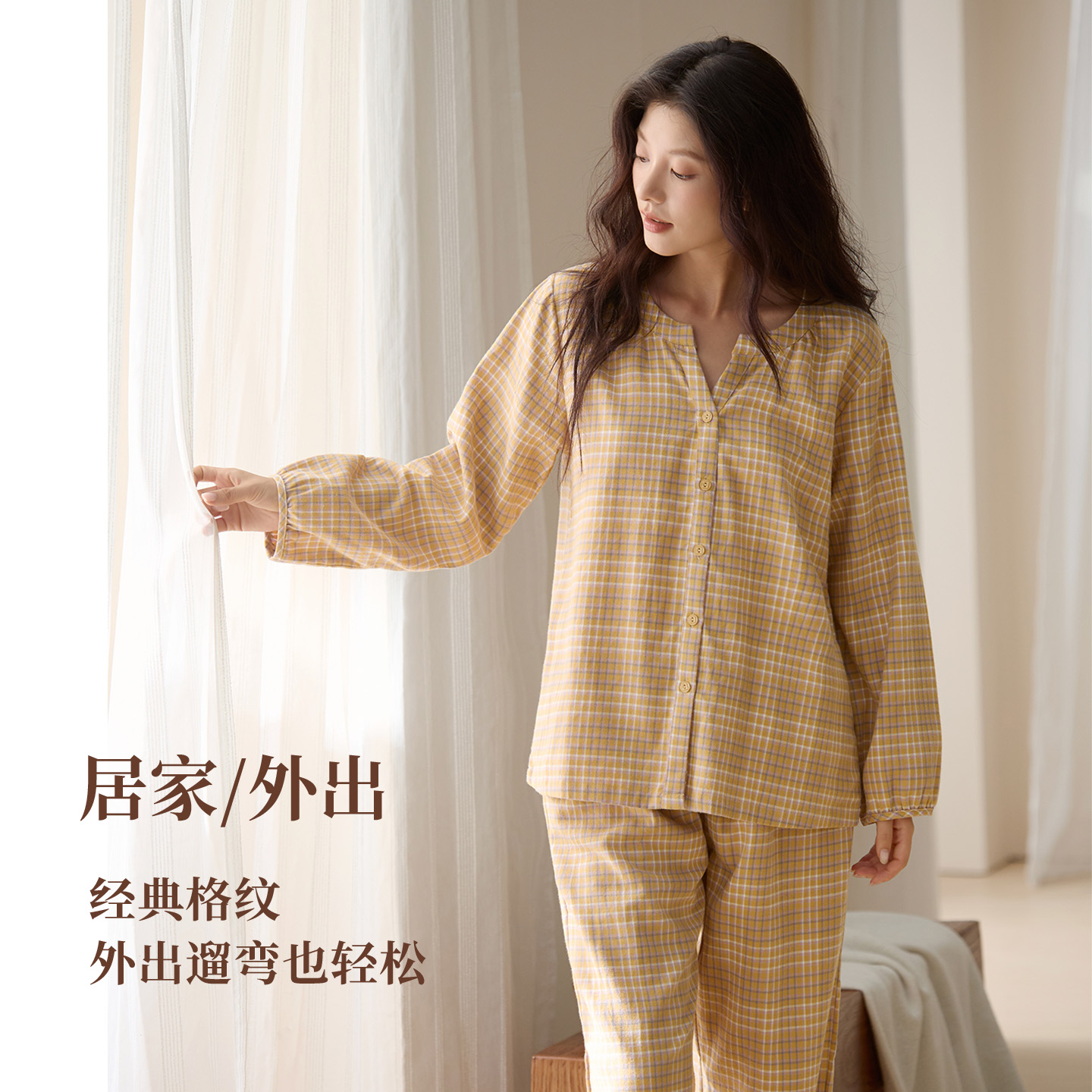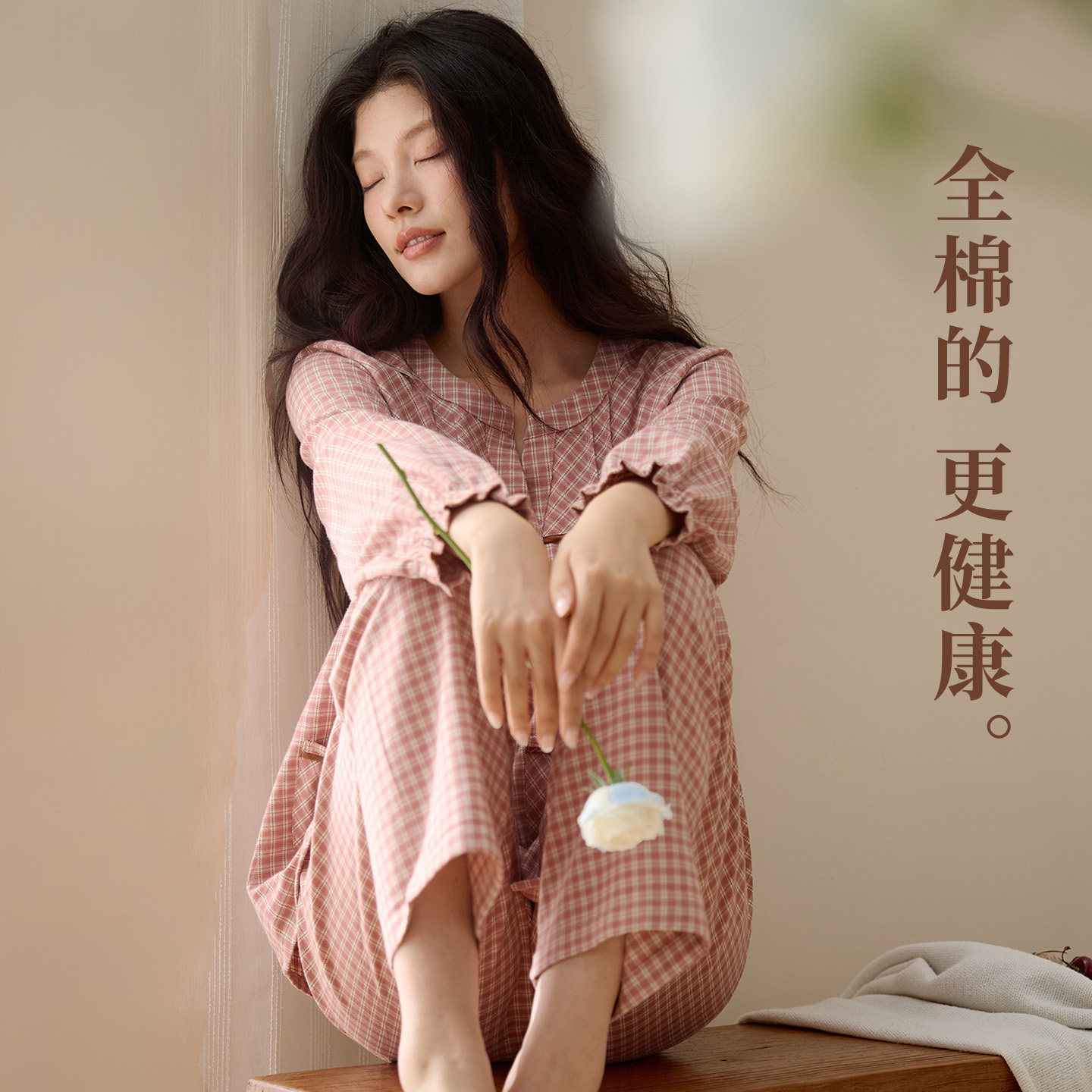 新一步纯棉秋睡衣女经典 格纹磨毛梭织棉色织优雅家居服可外穿套装