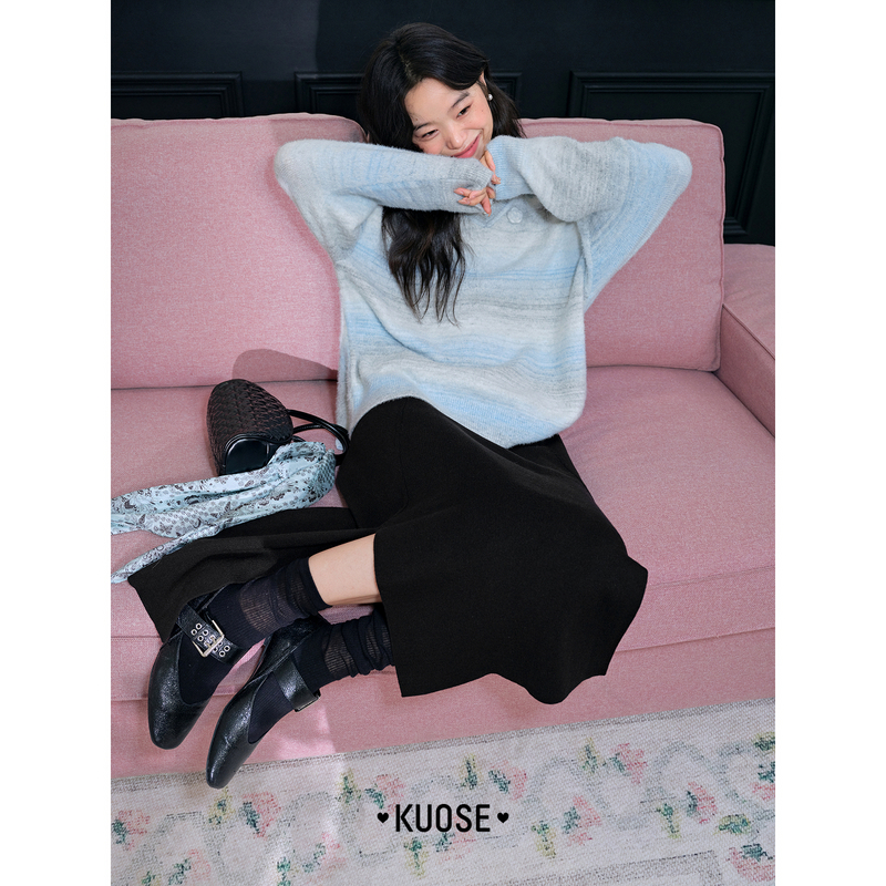 A字裙子 复古甜美高腰宽松中长款 紫涵蝴蝶结拼接半身裙女冬季 新款
