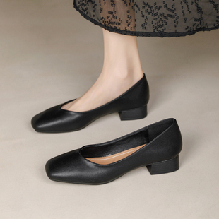 仙女风瓢鞋 秋季 浅口百搭中跟奶奶鞋 大码 真皮单鞋 女鞋 粗跟2025新款