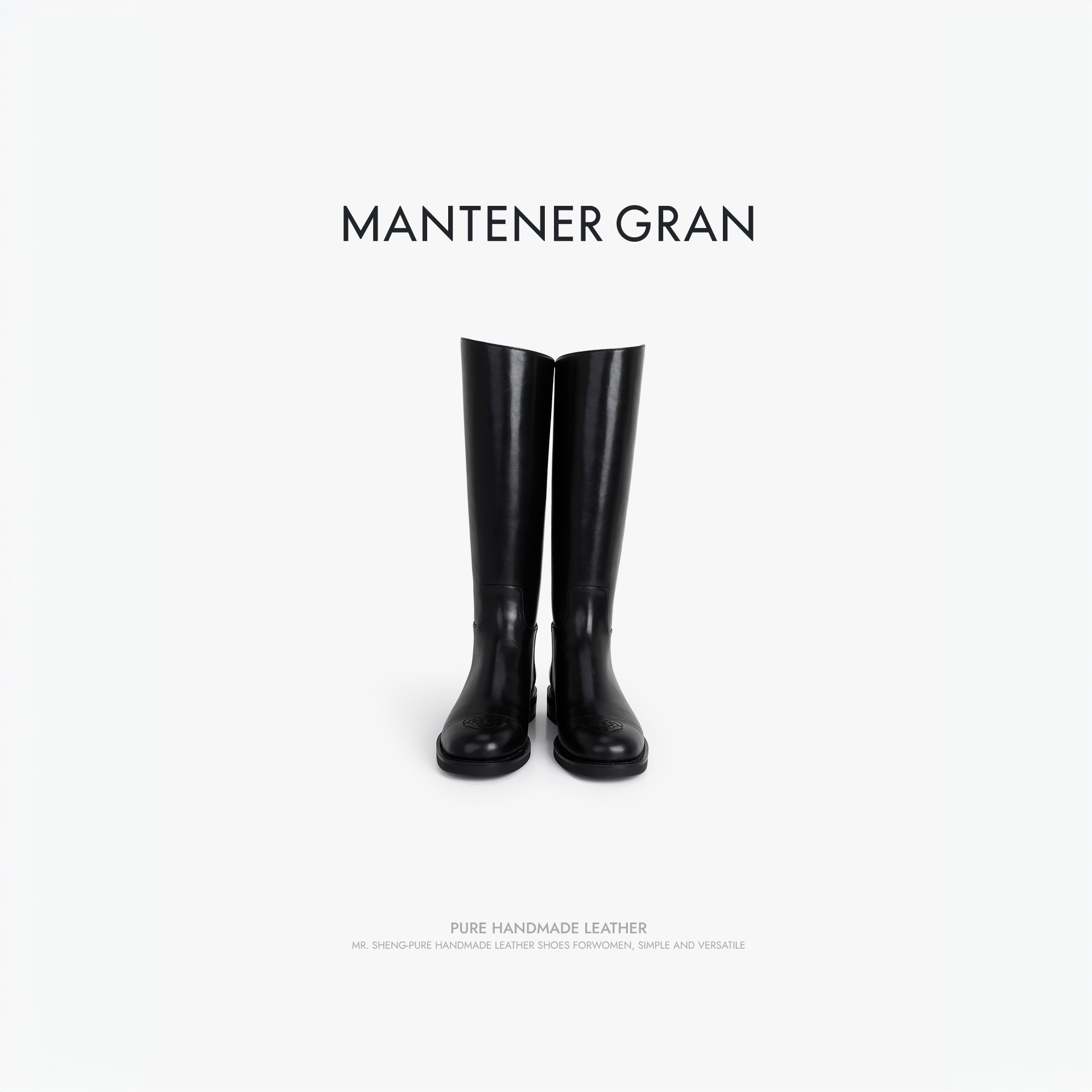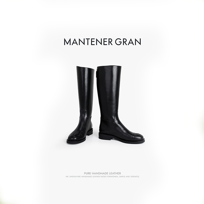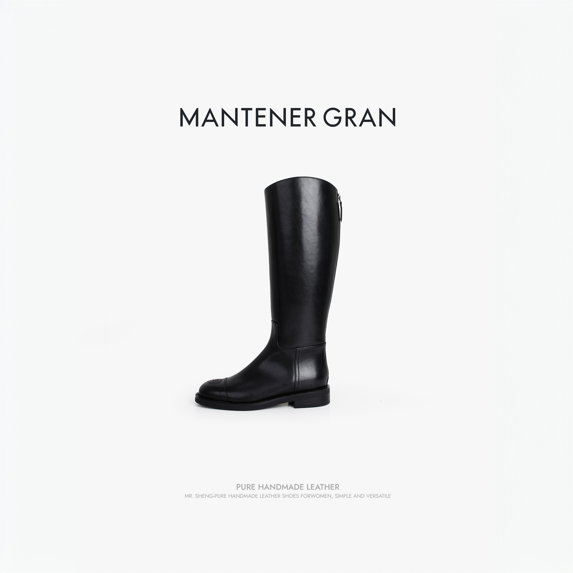 MantenerGran山茶花牛皮靴子女长筒靴英伦风骑士靴黑色长靴MG女鞋