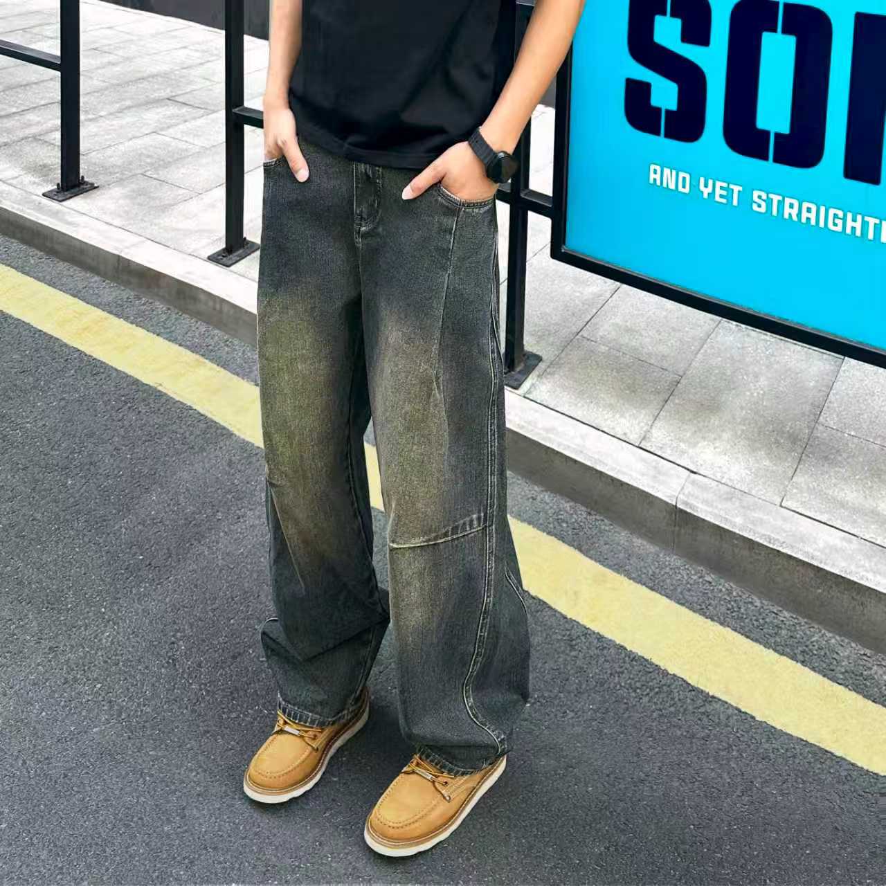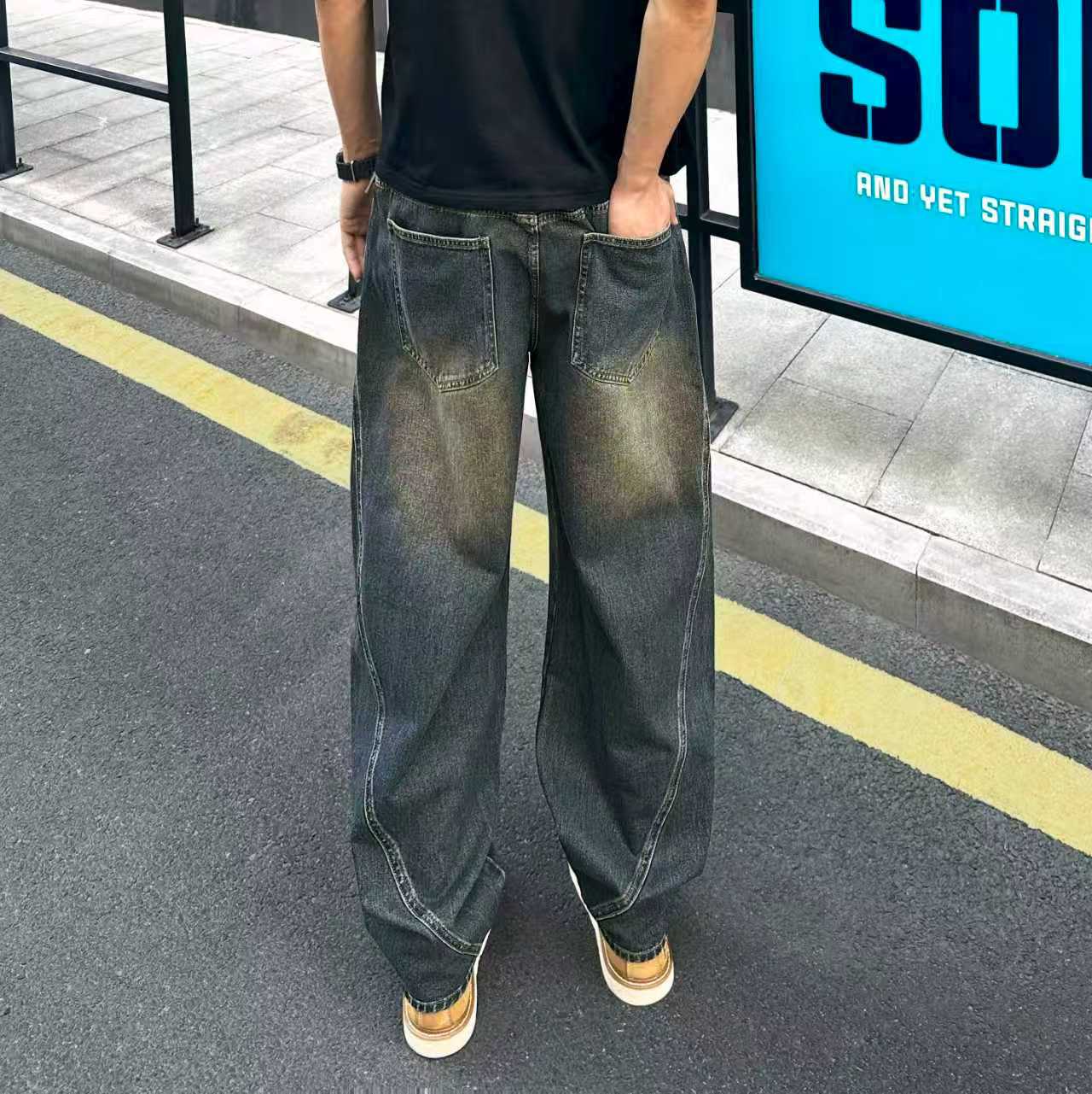 潮牌做旧拼接弯刀牛仔裤 男美式 高街泥黄蓝宽松直筒裤 QUALCOMM秋季