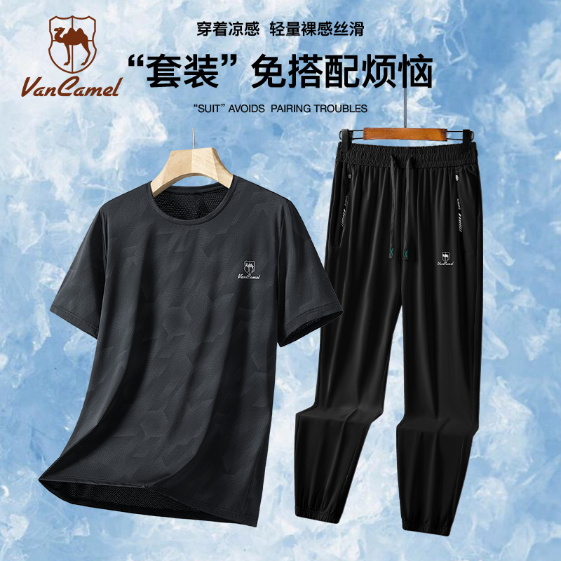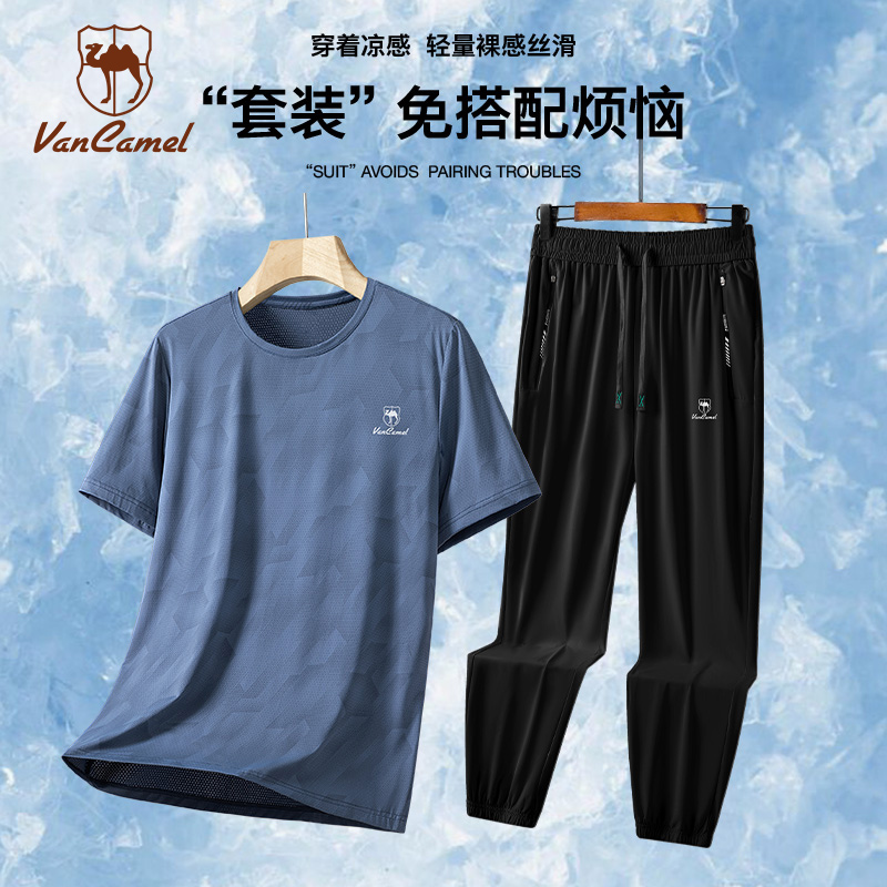 爸爸装 t恤冰丝长裤 休闲运动套装 速干短袖 子男 男款 西域骆驼夏季