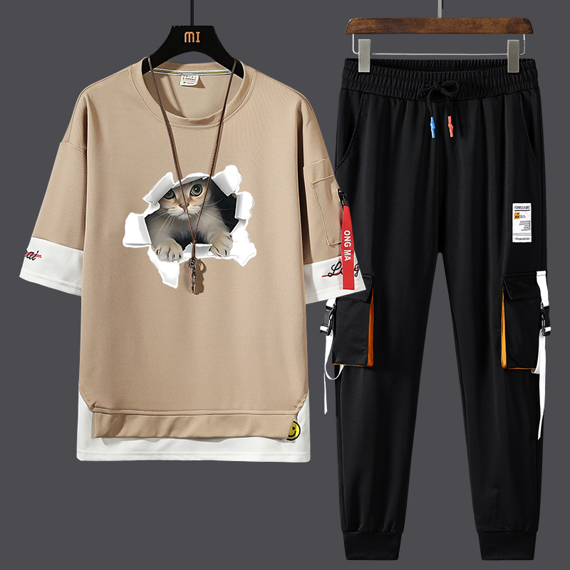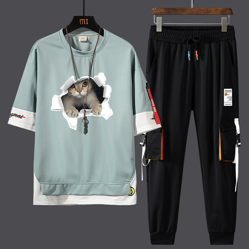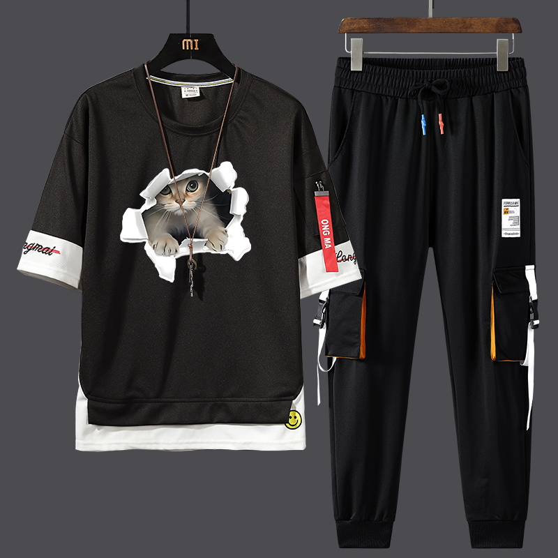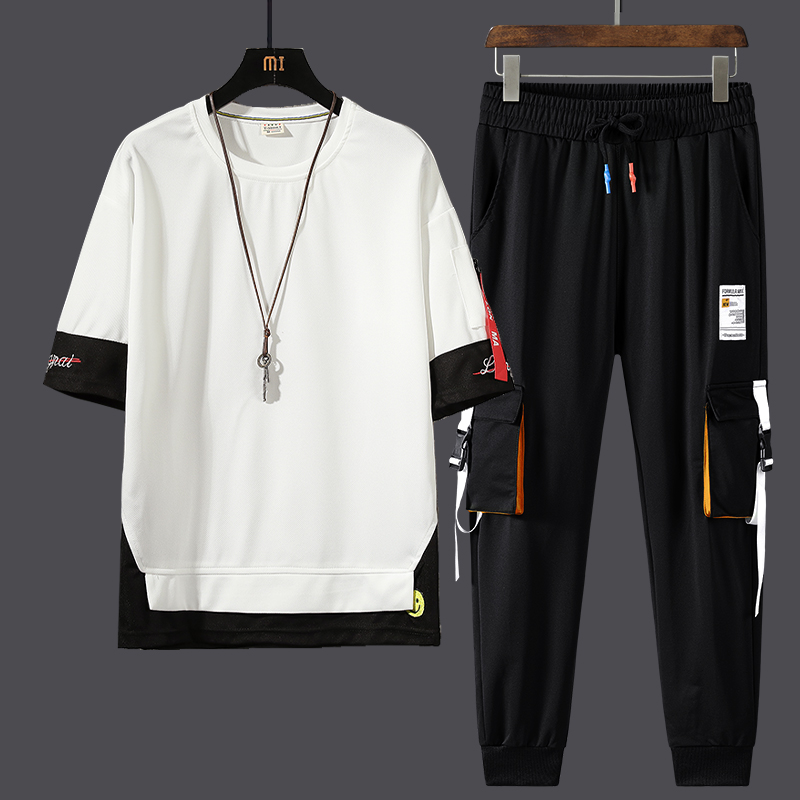 ins大码 夏季 潮牌t恤上衣搭配帅气长裤 男生休闲运动套装 青少年 新款