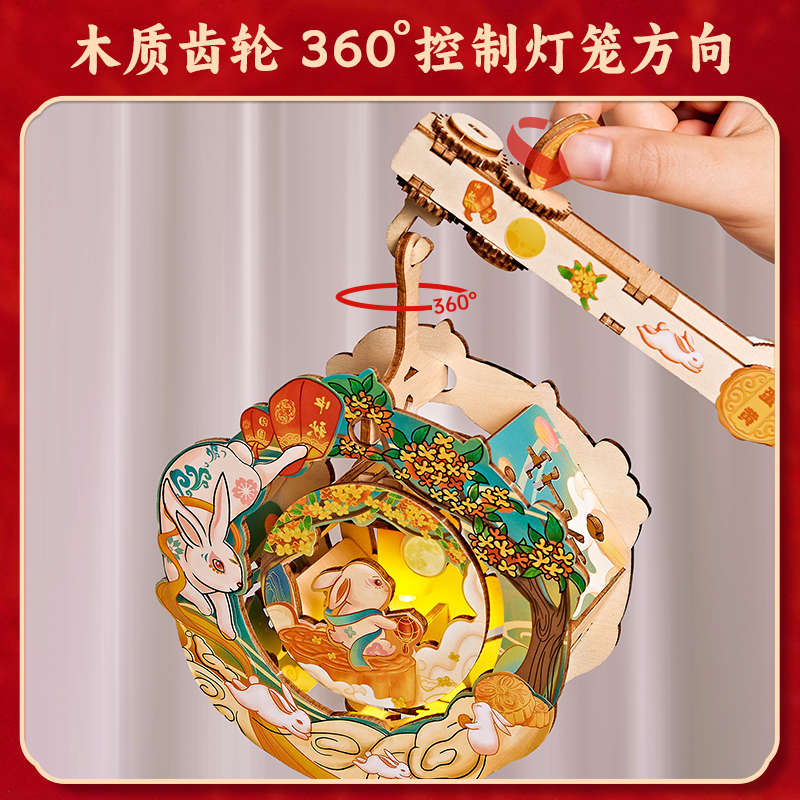 中秋节灯笼2025新款 木质手工diy制作儿童手提玉兔团圆转转灯花灯