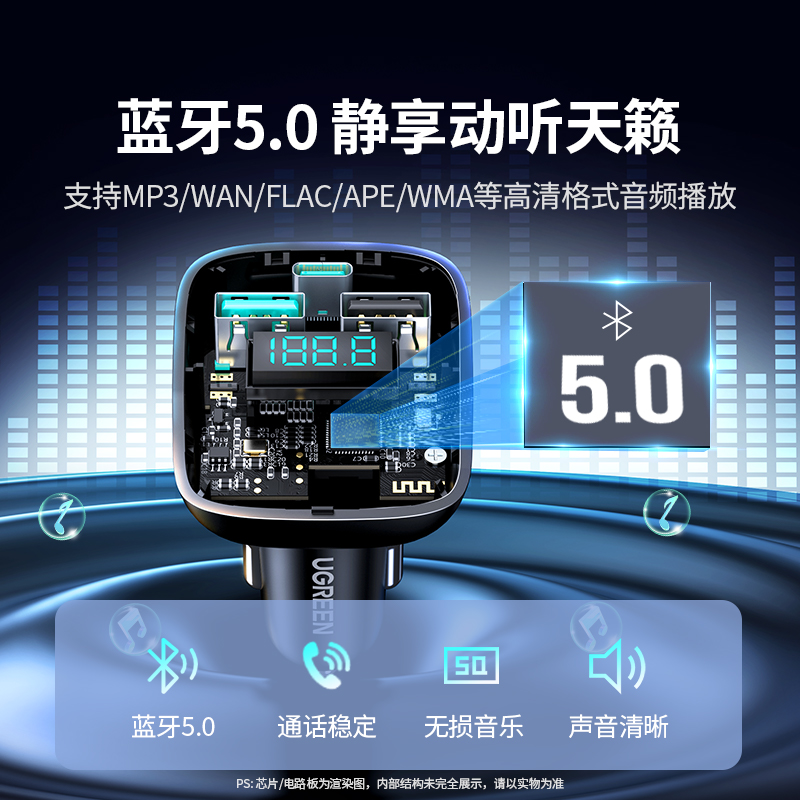 绿联车载蓝牙接收器无损音质FM发射器MP3播放器usb汽车转换充电器
