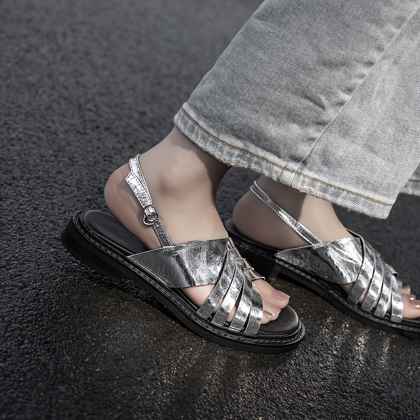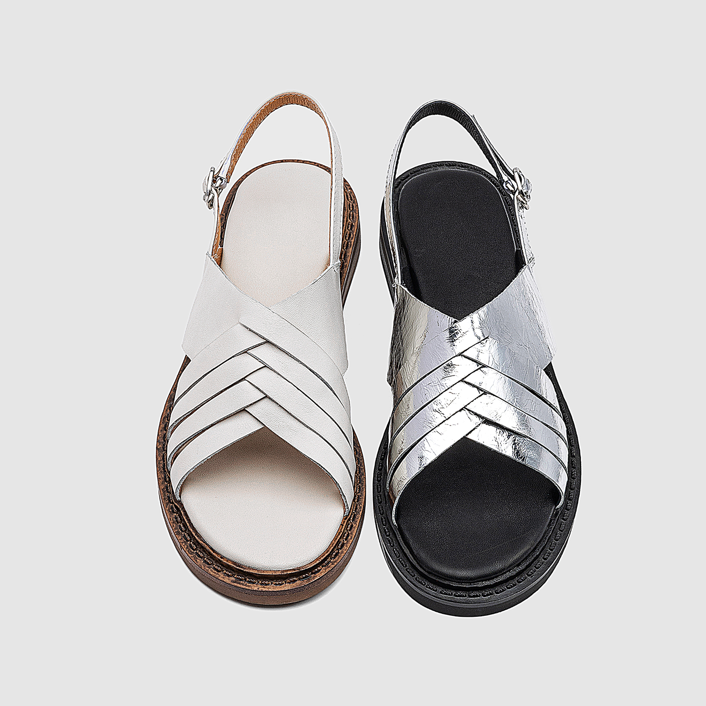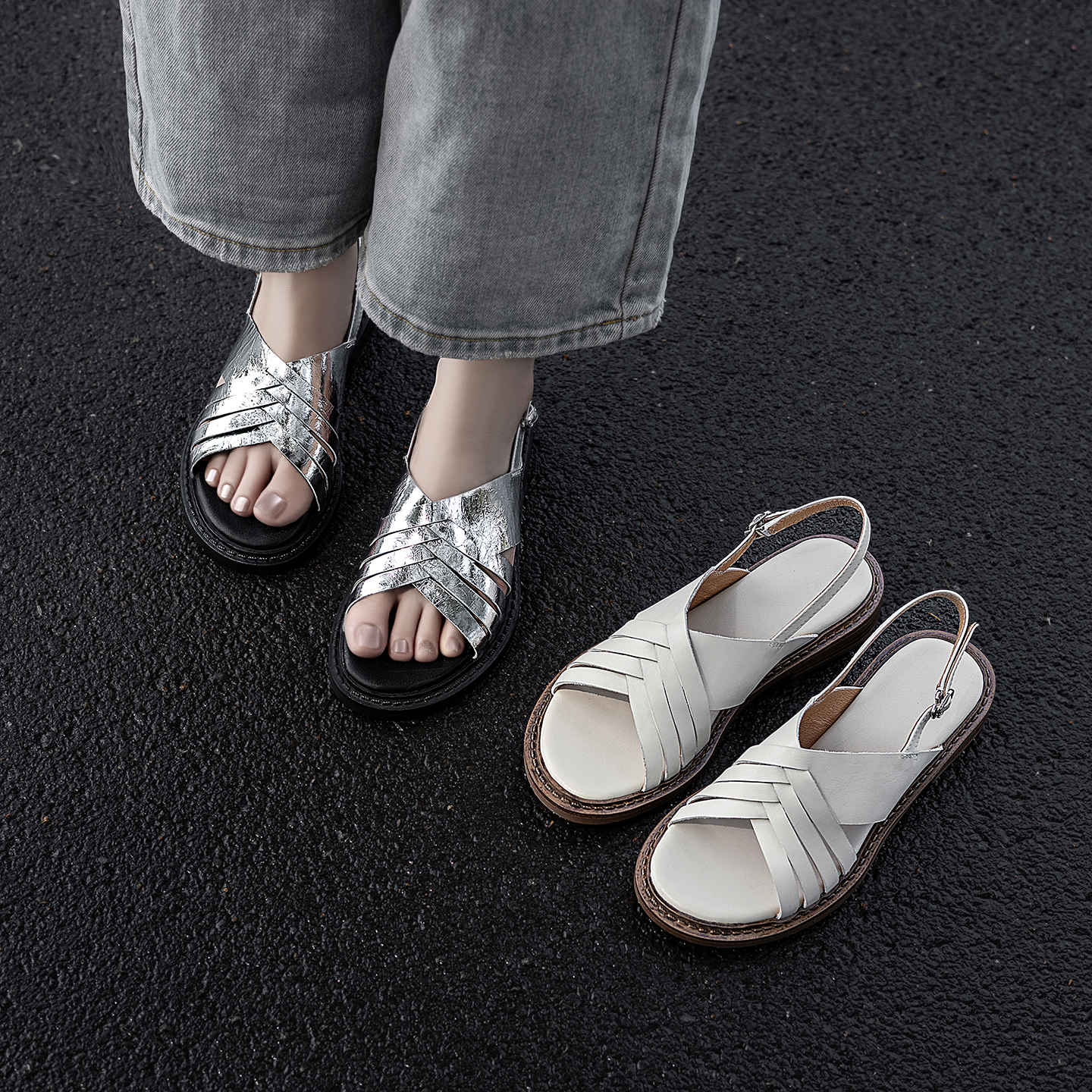 开怀依足结构凉鞋 复古日系文艺休闲 意大利牛皮粗跟编织外穿凉鞋