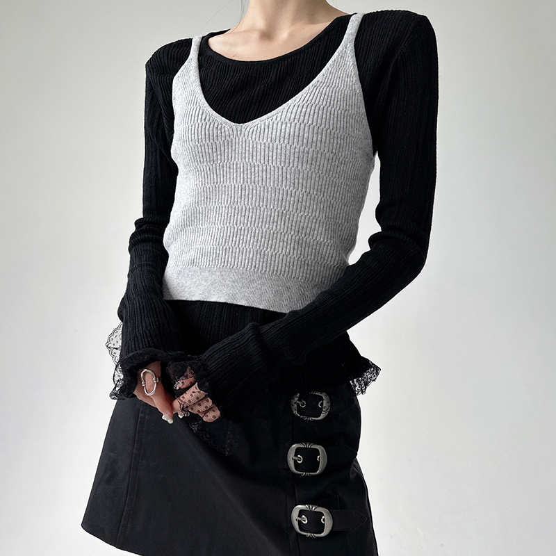 修身 新款 黑色吊带背两件套 女2025秋冬装 设计感小众蕾丝花边针织衫