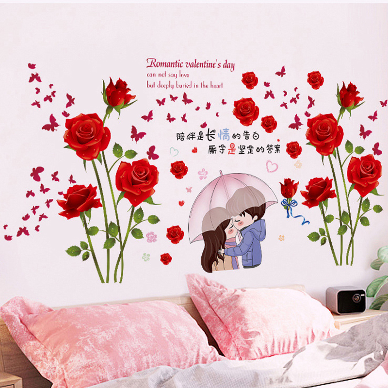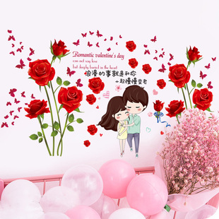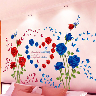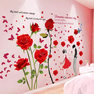 卧室床前床头墙面墙纸红色玫瑰花丛墙贴纸自粘装 饰画墙壁贴画