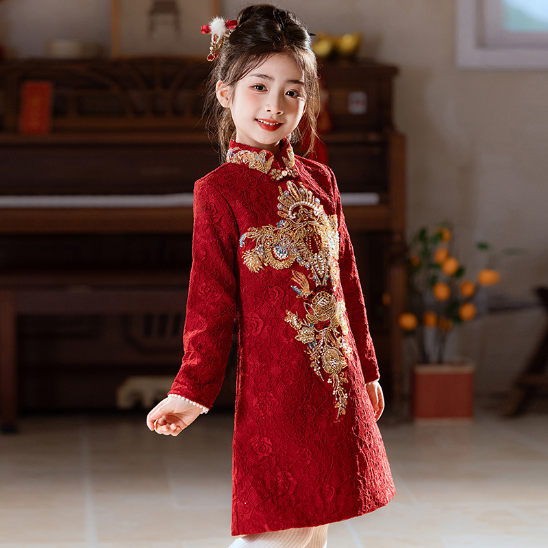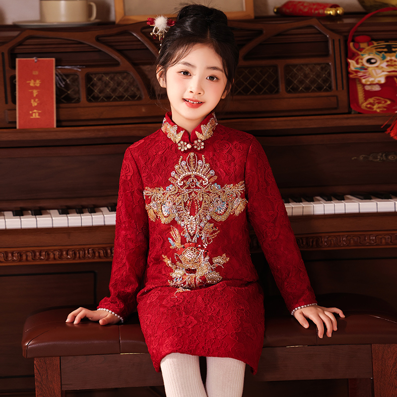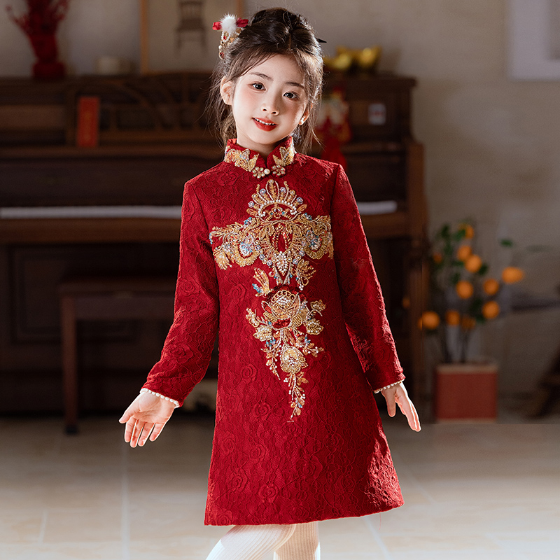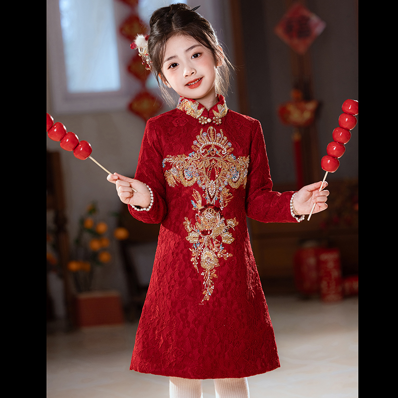 秋冬季 拜年服女童新年连衣裙2025新款 红色宝宝唐装 儿童旗袍新中式