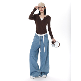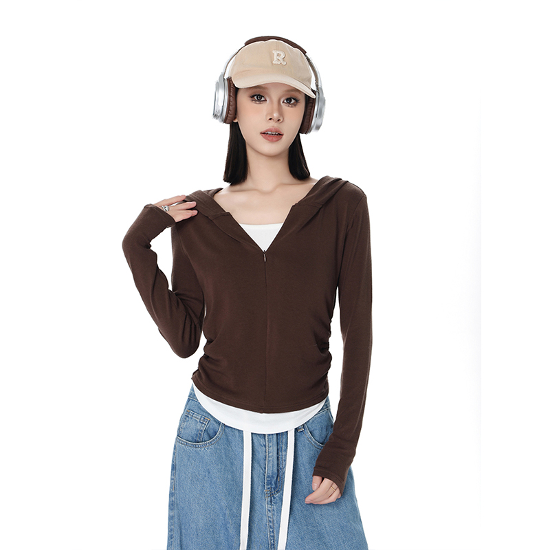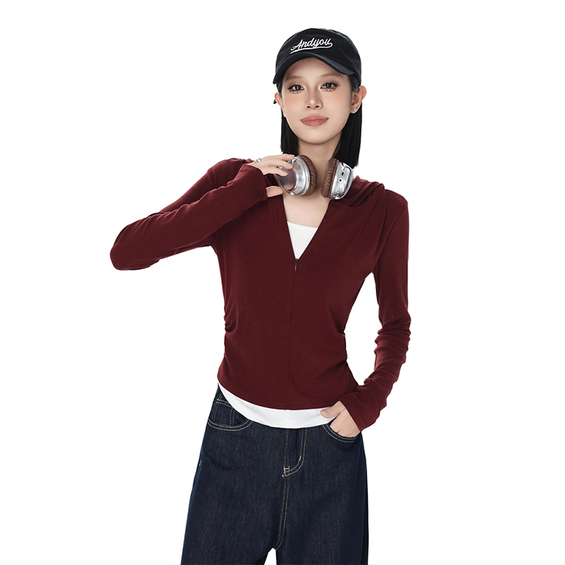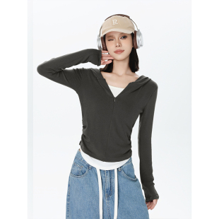 新款 t恤打底衫 修身 内搭长袖 显瘦短款 连帽v领假两件女上衣外穿秋季