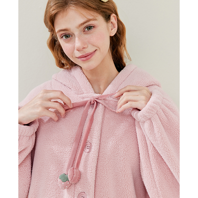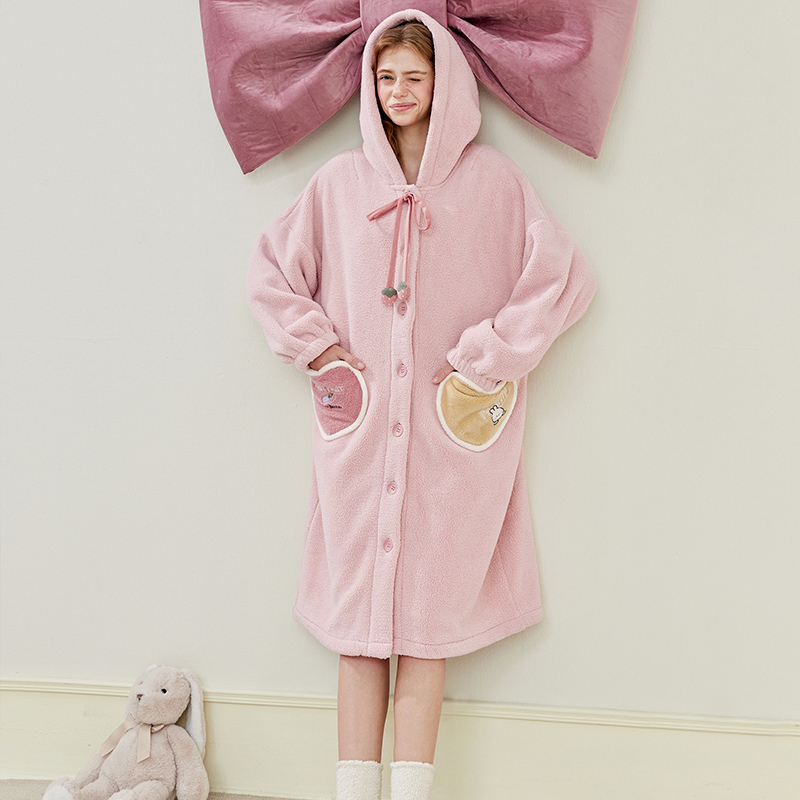 芬腾女士睡袍珊瑚绒秋冬加厚连帽睡衣女款 法兰绒可外穿家居服浴袍
