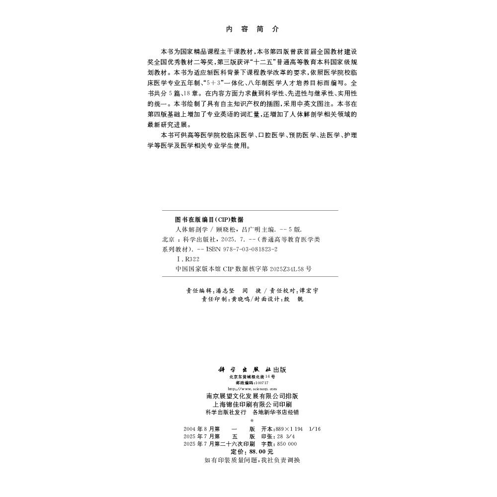 十四五普通高等教育本科医学类规划教材9787030818232科学出版 人体解剖学 吕广明 顾晓松 社 第五版