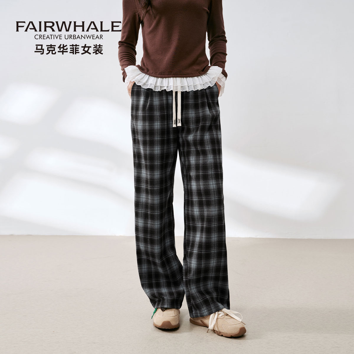 高腰慵懒宽松春秋休闲长裤 马克华菲复古格子直筒阔腿裤 女2025新款