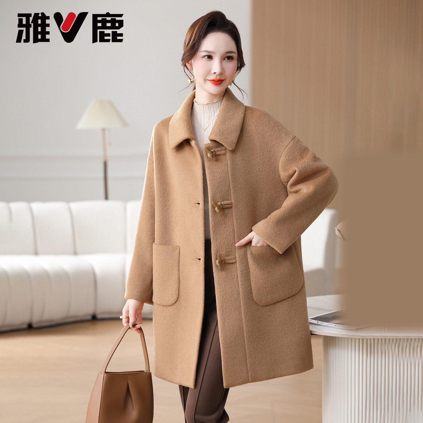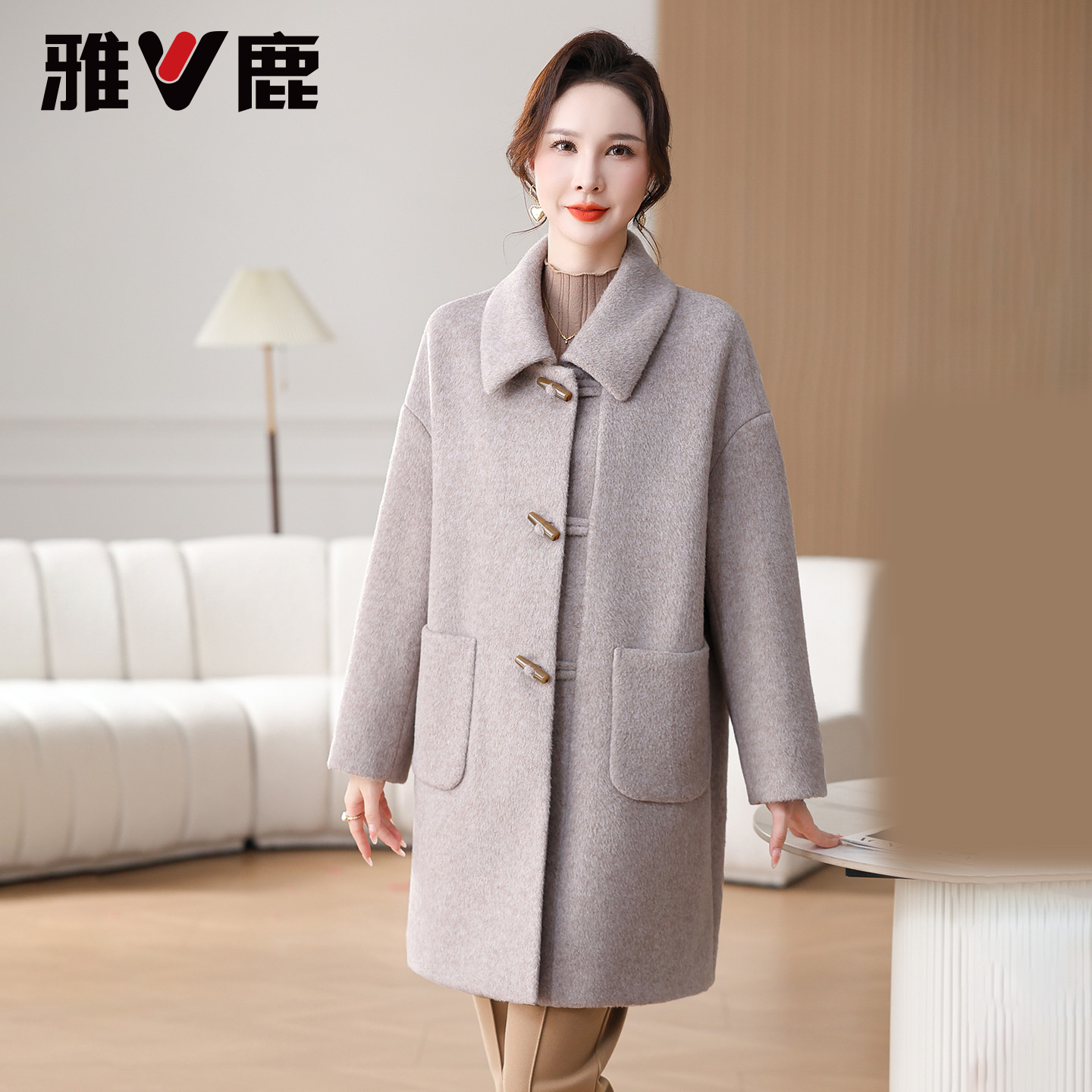 翻领妈妈装 新款 毛呢大衣 大口袋2025秋冬季 雅鹿中老年外套女中长款
