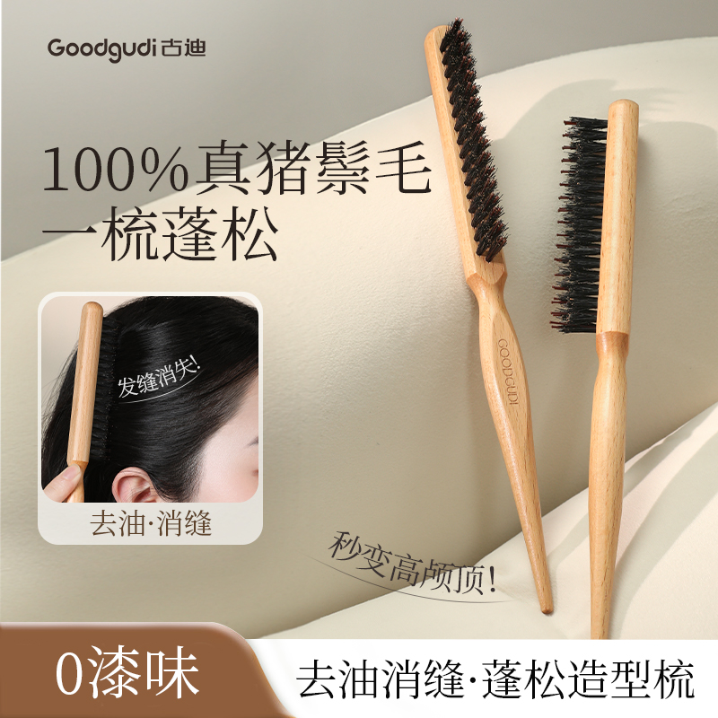 古迪100%猪鬃毛梳子蓬松高颅顶三排密齿顺发缝专用造型尖尾木梳女
