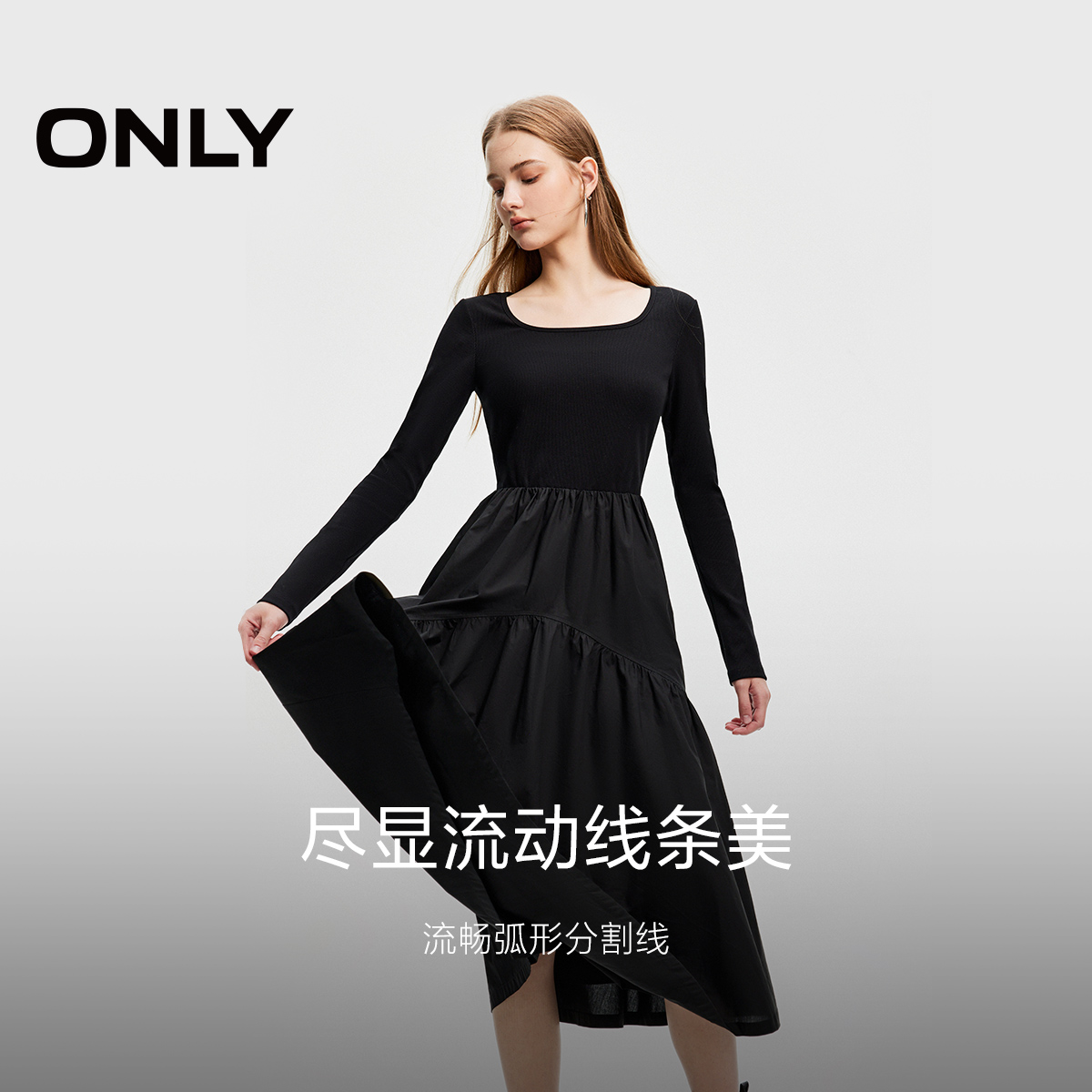 124307071 针织拼接长裙连衣裙女 ONLY夏季 通勤优雅方领长袖