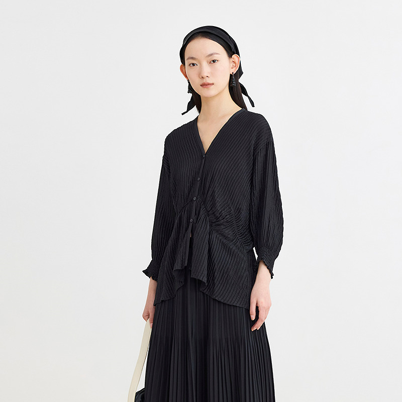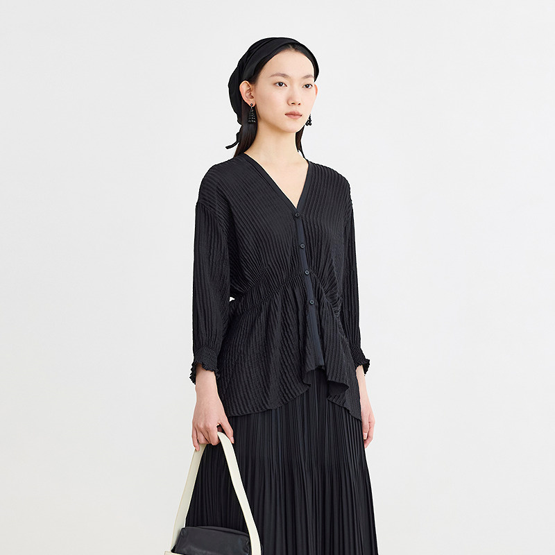 肌理感真丝衬衫 收腰修身 AUM噢姆夏季 黑色桑蚕丝上衣女 水纹衫