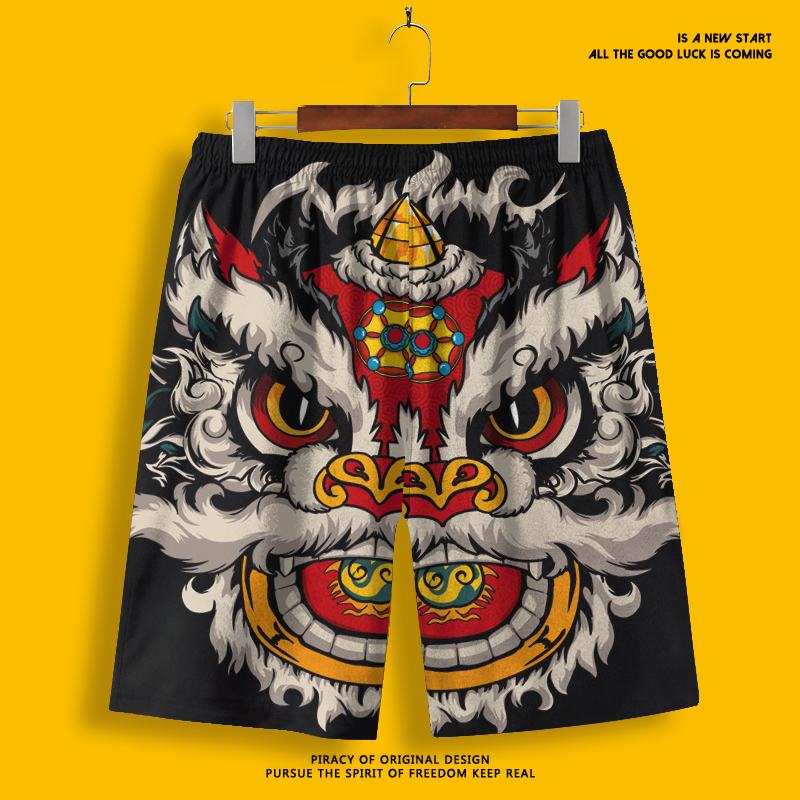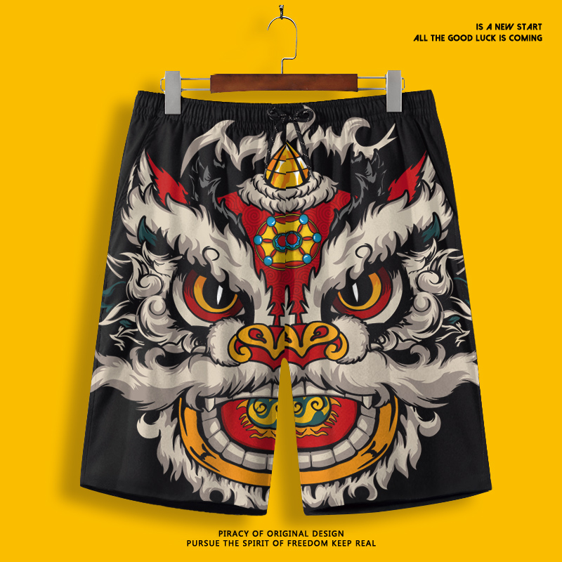 男士 大码 中国风醒狮印花5五分裤 速干沙滩裤 夏季 国潮华夏舞狮短裤