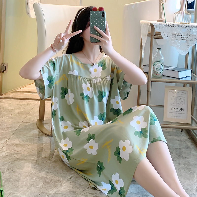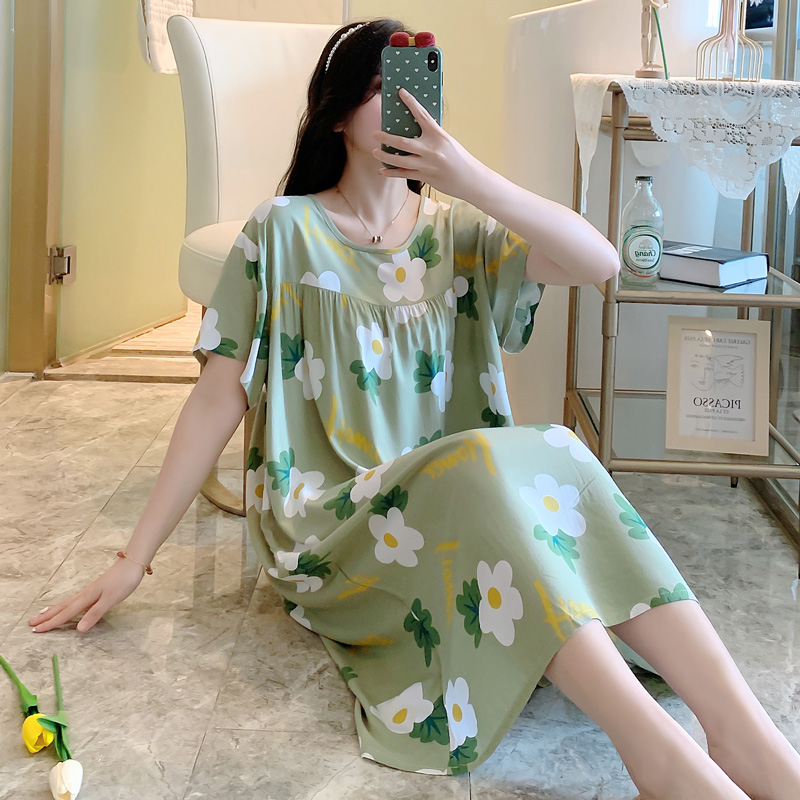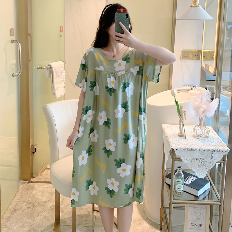 睡衣夏季 韩版 加大码 棉绸睡裙女士短袖 人造棉宽松舒适家居服 加长款