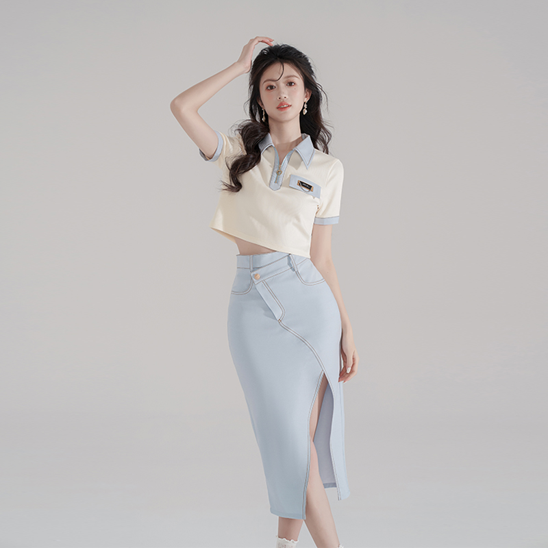 Polo领拉链针织T恤上衣不规则包臀裙两件套 清仓价