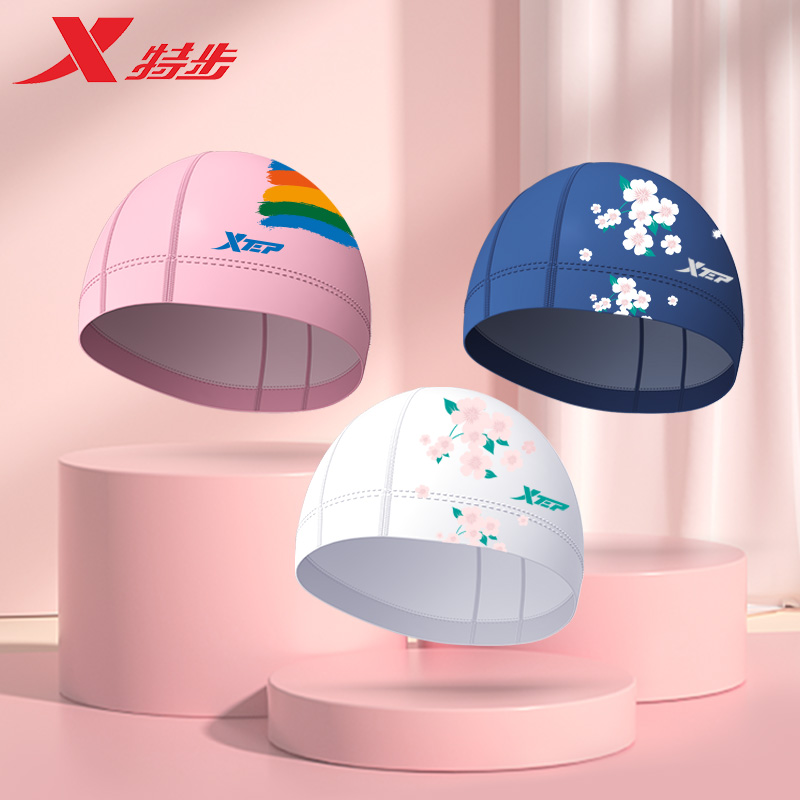 特步泳帽女款 成人pu护耳专业长发加大硅胶防水游泳帽子 不勒头男士
