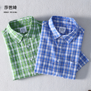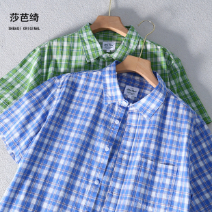 男短袖 纯棉格子衬衫 纯棉男宽松休闲蓝绿格子衬衣翻领寸衣 薄款 夏季
