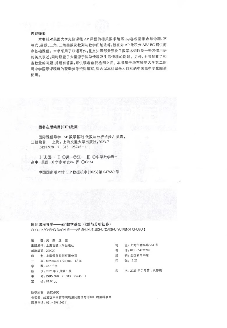 社 函数三角函数数列与数学归纳法等数学习题上海交通大学出版 国际课程导学AP数学基础 代数与分析初步内含集合与命题不等式