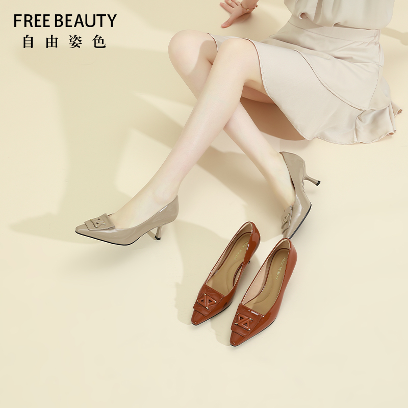 烤漆饰扣浅口单鞋 牛漆皮轻奢质感优雅高跟鞋 新款 自由姿色春季