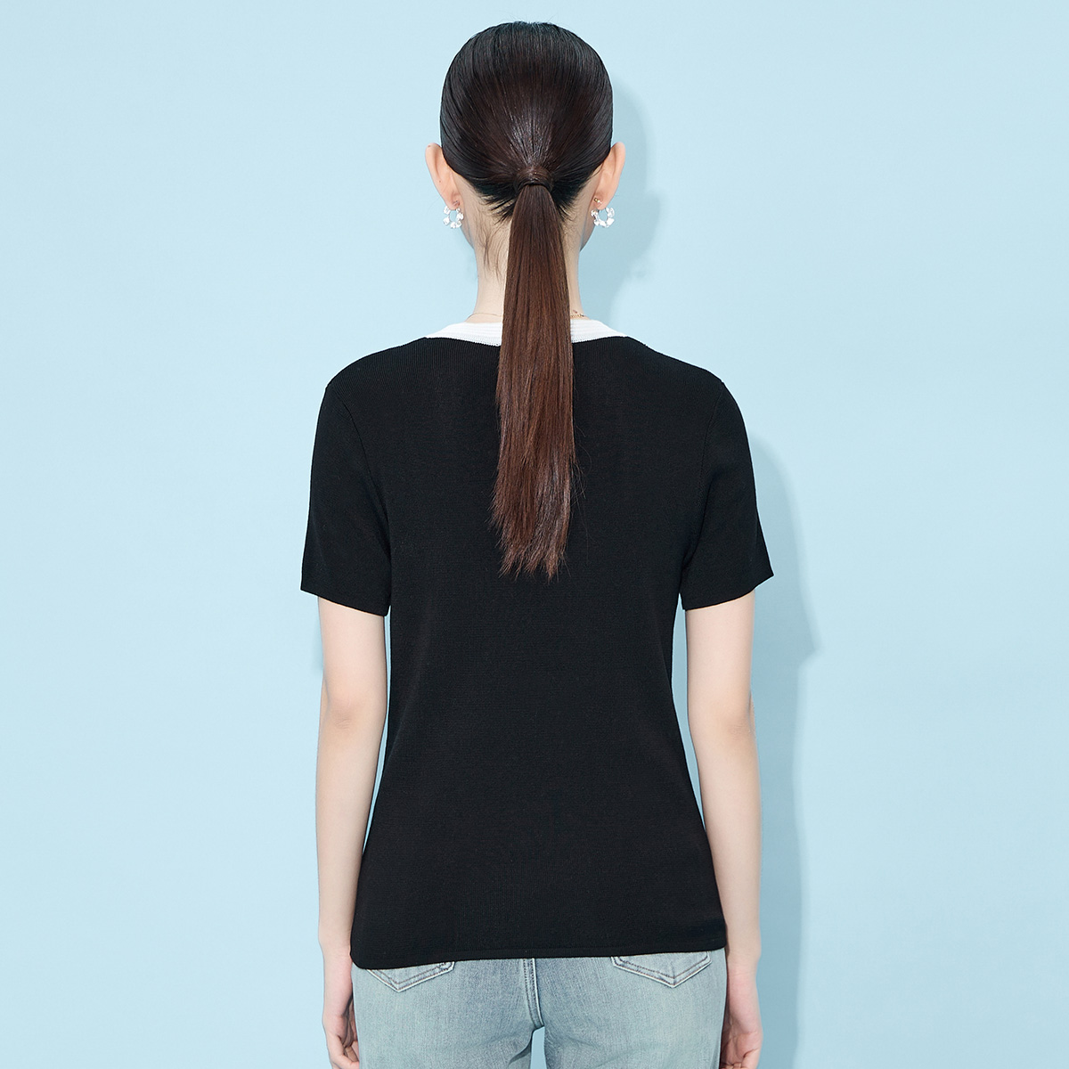 新款 时尚 黑色莱赛尔针织衫 上衣女装 V领蝴蝶结短袖 马天奴2025夏季