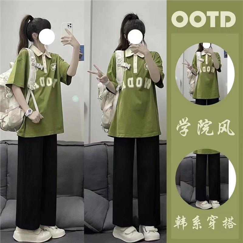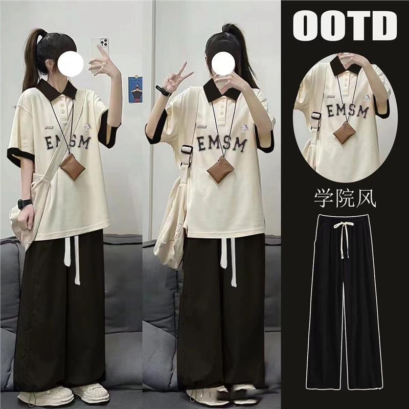 T恤盐系阔腿裤 单 女学生慵懒风学院风POLO短袖 2025夏季 一整套 套装