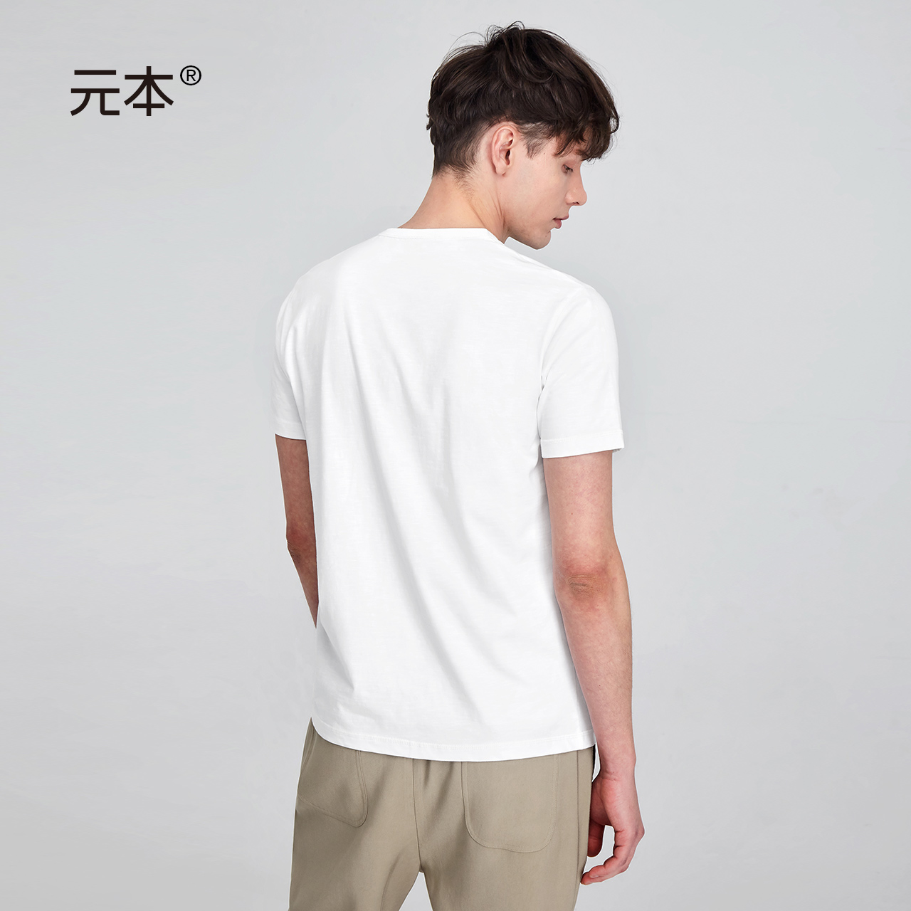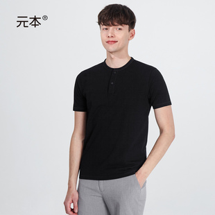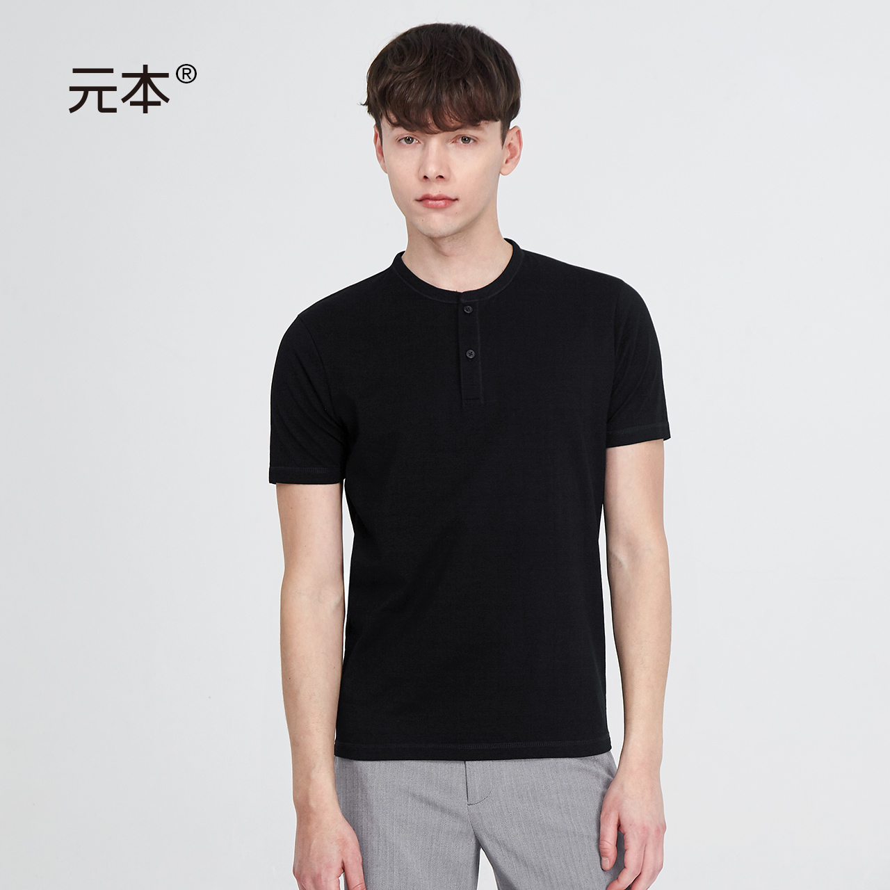 本 水洗半开襟休闲纯色打底衫 舒适竹节棉亨利领短袖 男修身 T恤 元