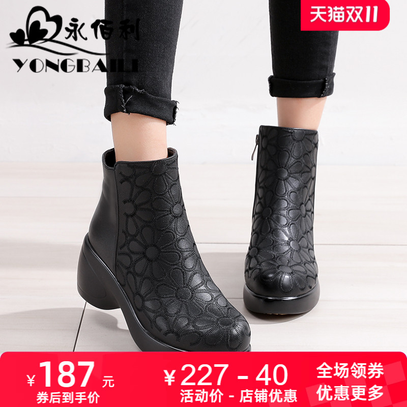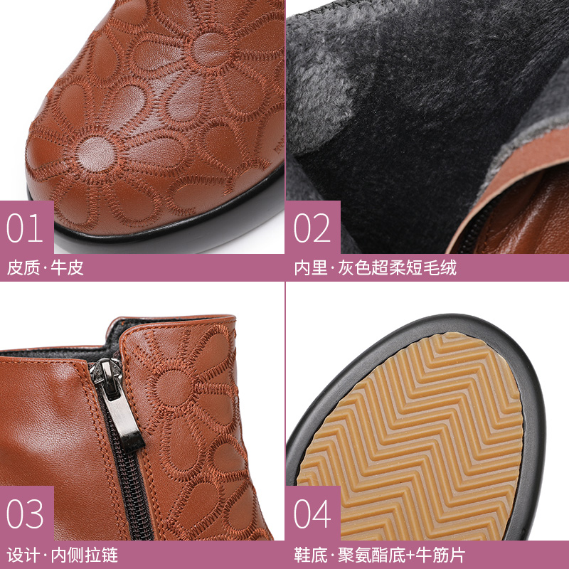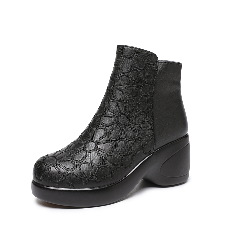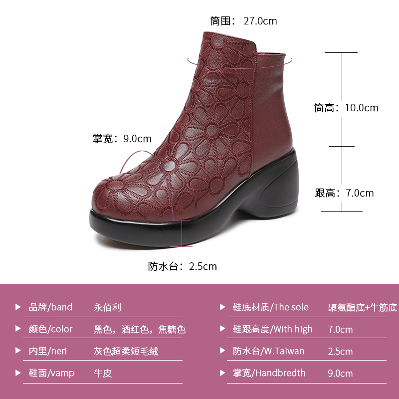 真皮绣花厚底短靴女2025冬新款 加绒保暖舒适女靴高跟牛皮靴子皮鞋