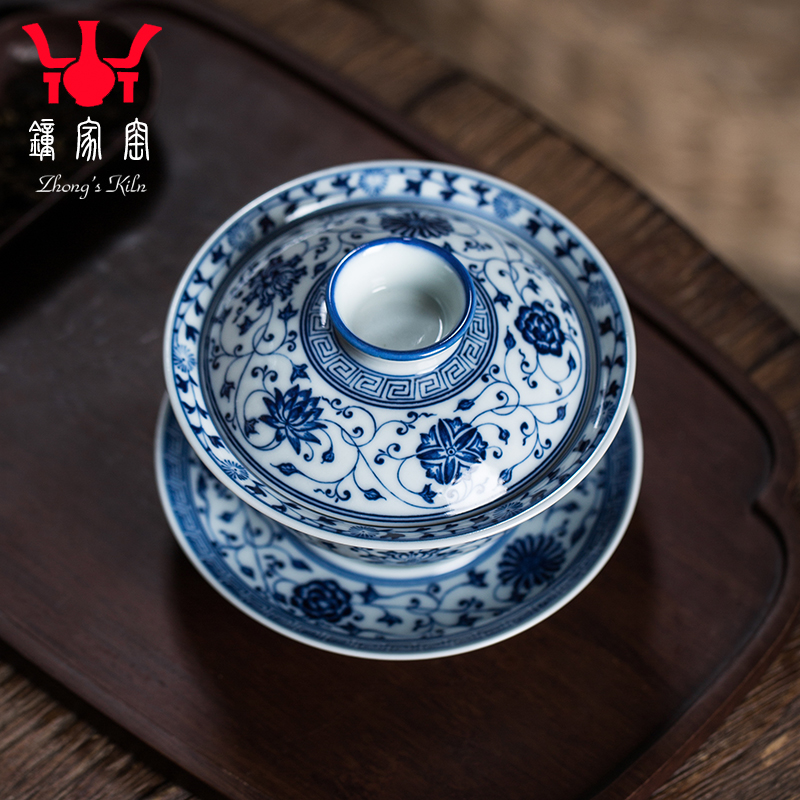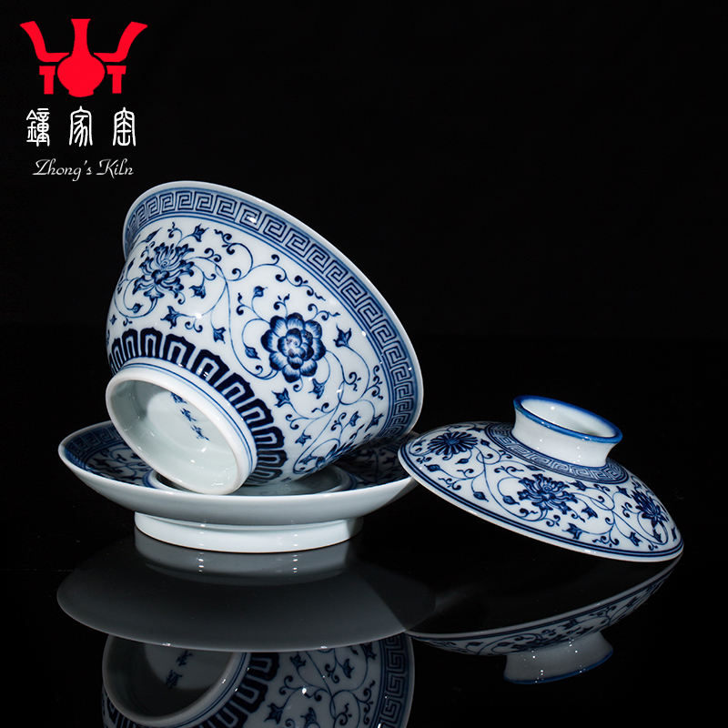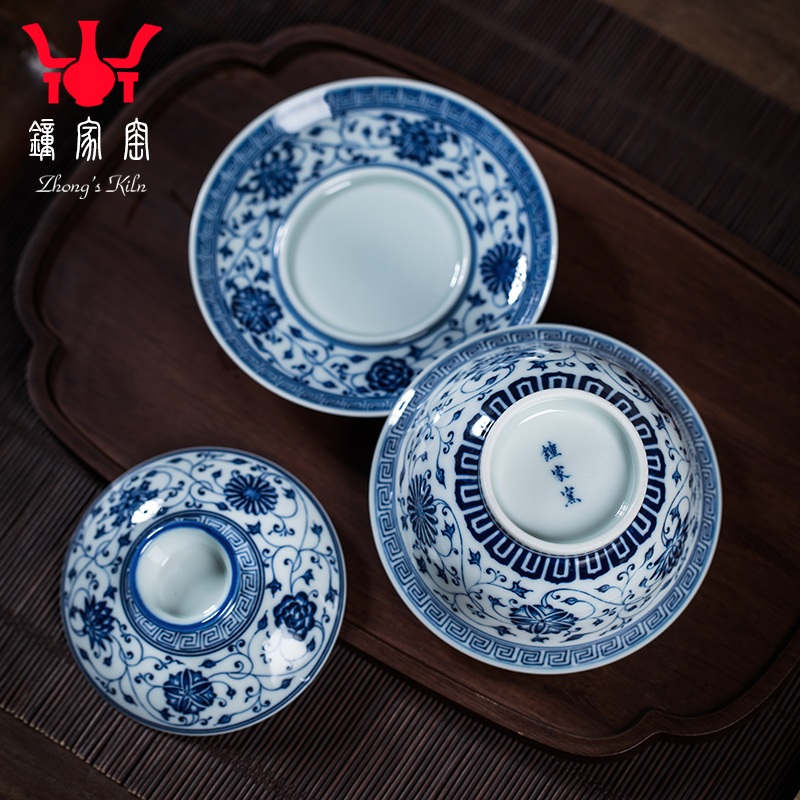 钟家窑盖碗茶杯手绘缠枝莲青花柴窑三才碗景德镇泡茶碗送礼礼盒装