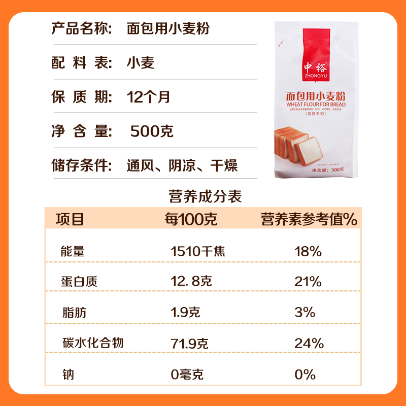 家用烘焙原料拉丝吐司面包专用小麦粉 中裕面粉 高筋面包粉500g