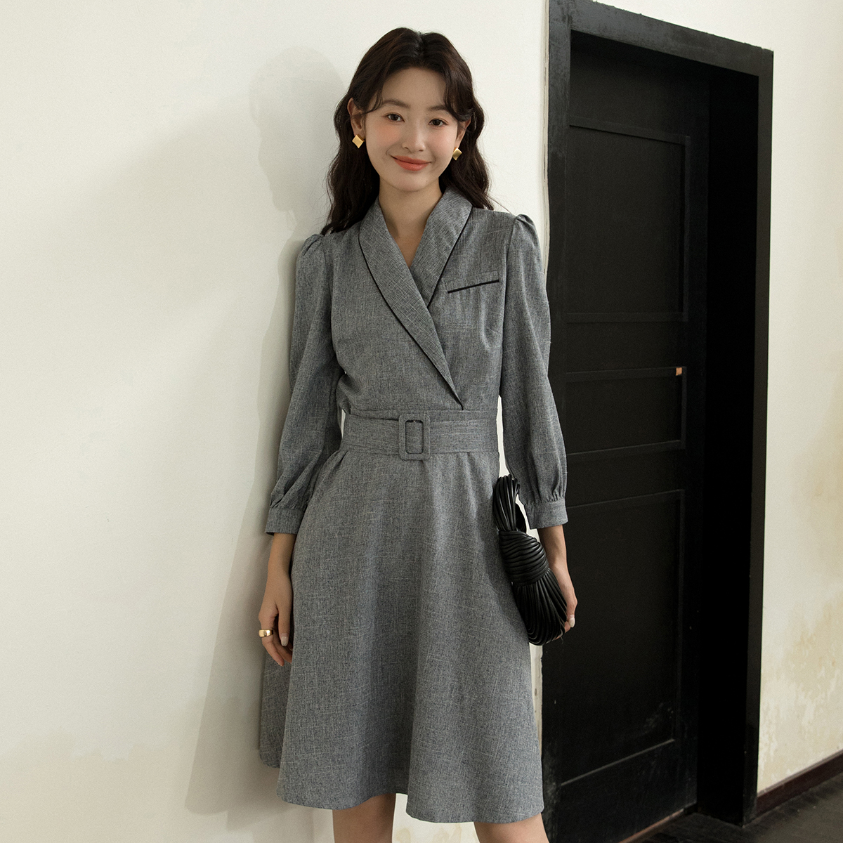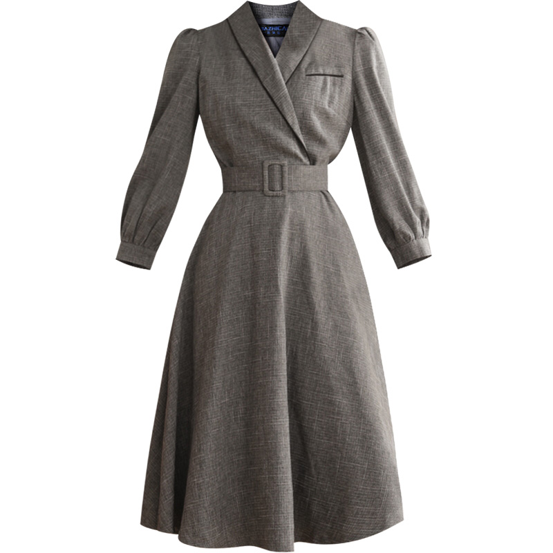 优雅收腰伞裙 复古灰色优雅赫本风连衣裙上班白领法式 秋季 新款