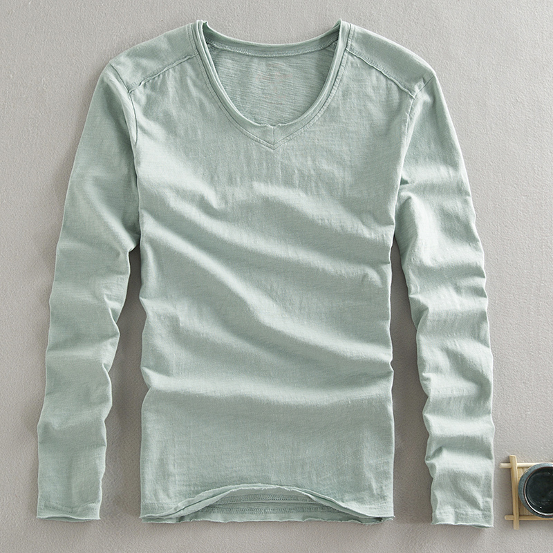 宽松竹节棉T恤衫 男长袖 纯色内搭秋衣潮 日系复古V领打底衫 春秋季