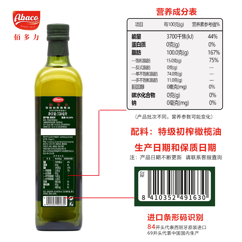 蓓琳娜欧洲原装 进口100%特级初榨橄榄油750ml轻食健康炒菜食用油