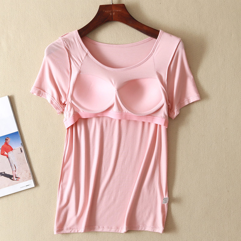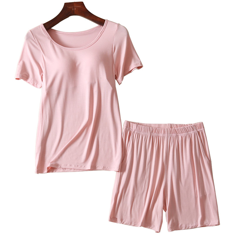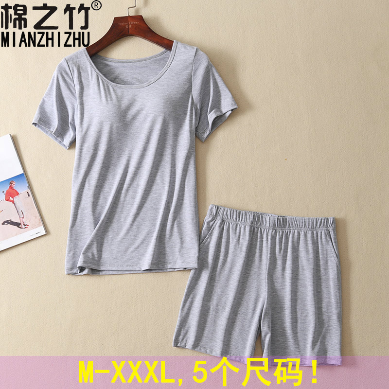 睡衣女夏季 半袖 两件套装 春秋短裤 休闲家居服 带胸垫短袖 莫代尔大码