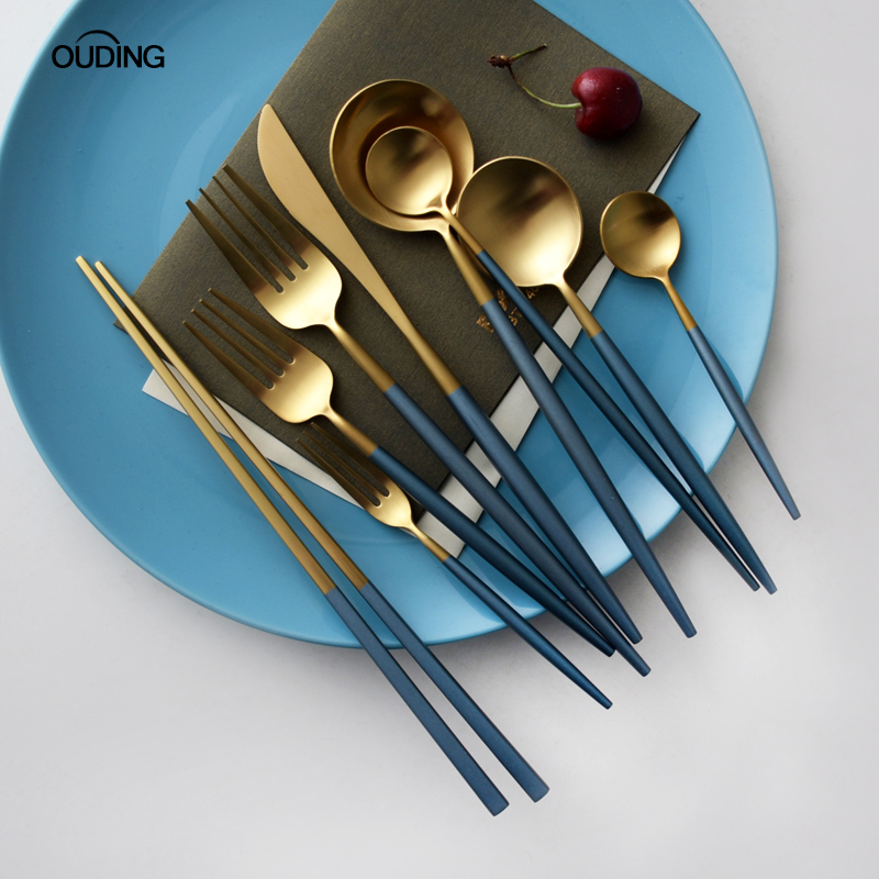 瑕疵清仓 葡萄牙水果叉咖啡勺甜品勺 蓝金刀叉勺不锈钢西餐具