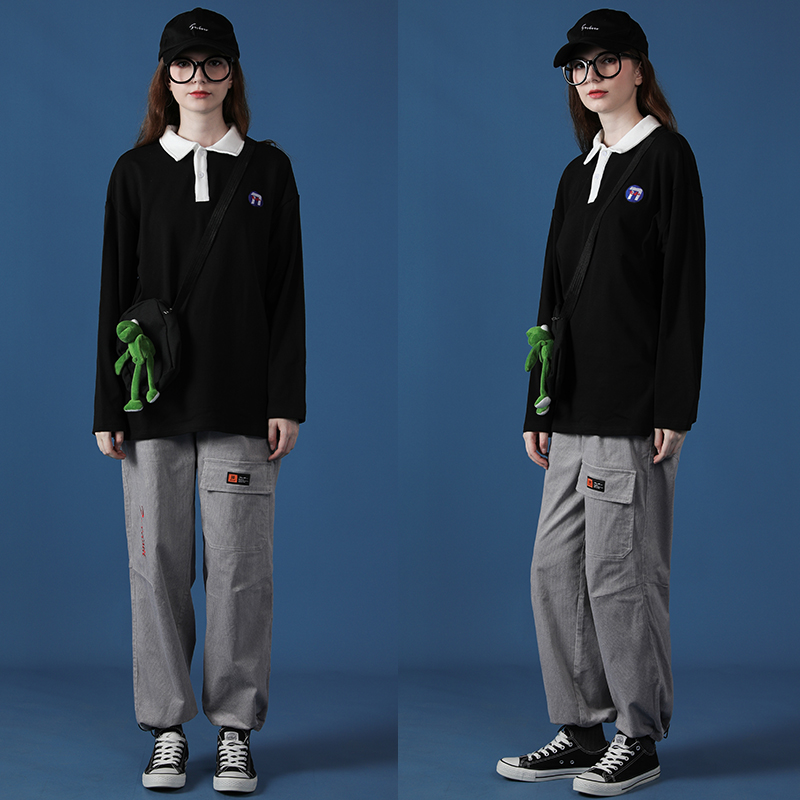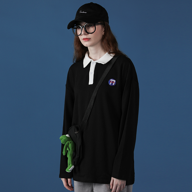 撞色POLO衫 黑色T恤女长袖 宽松bf韩版 中长款 ins潮 春秋薄款 清仓新款