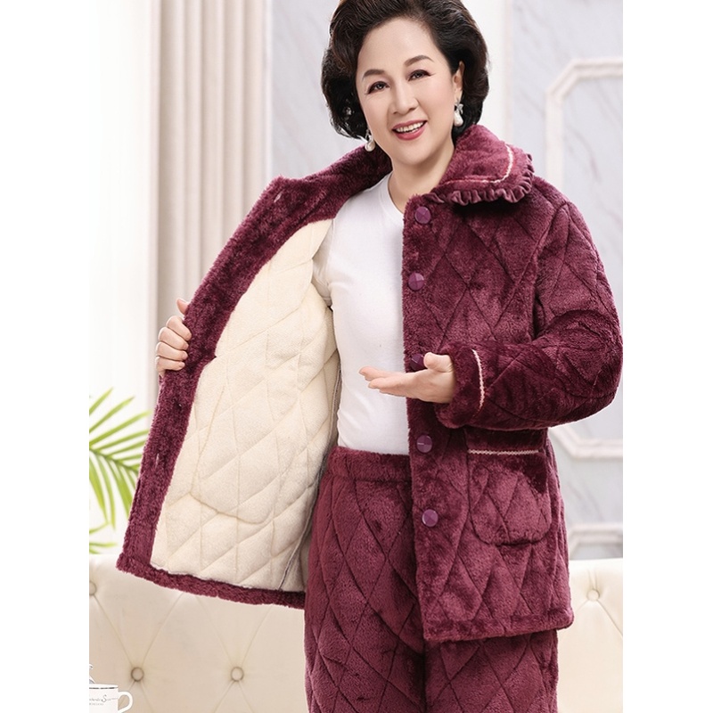 法兰绒家居服套装 睡衣女秋冬季 三层加厚珊瑚绒夹棉袄加绒保暖新款