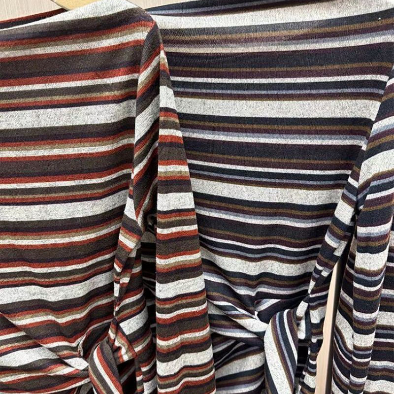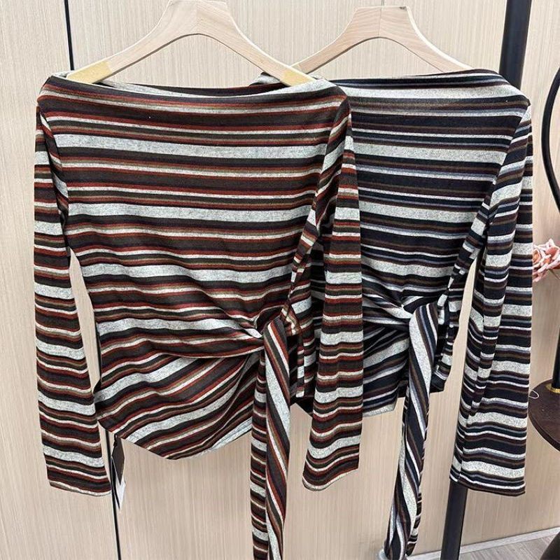 2025秋冬一字领条纹长袖 甜辣风绑带设计感显瘦上衣潮ins T恤女新款