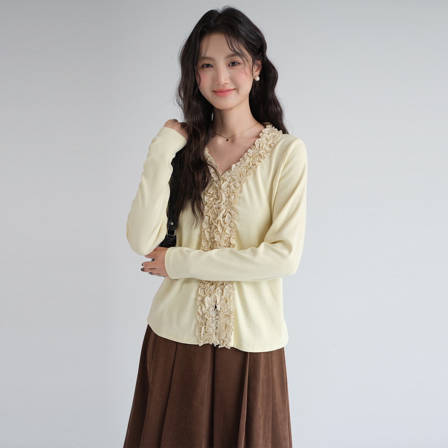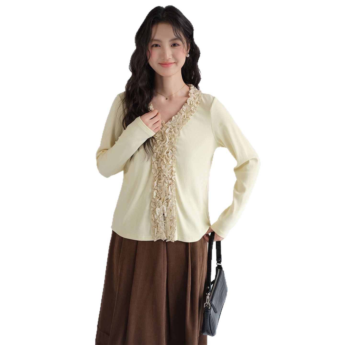 2025秋冬新款 蓝若水大码 别致甜辣上衣 木耳花边V领针织打底衫