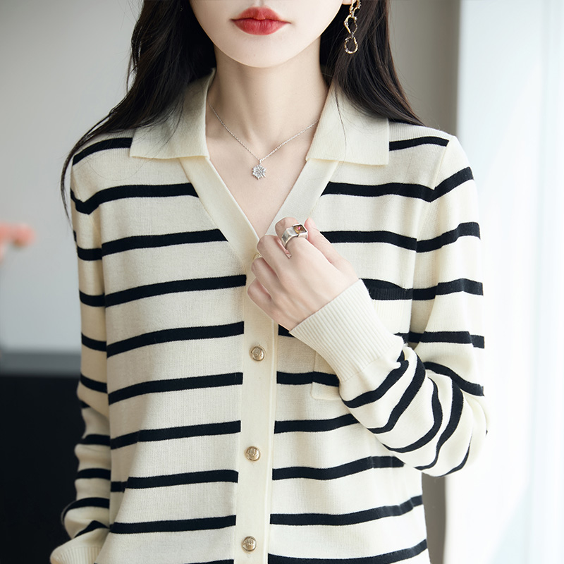秋冬洋气减龄毛衣外套条纹上衣长袖 女2025新款 薄 开衫 方领针织衬衫
