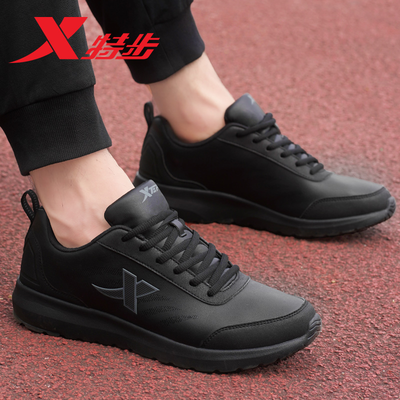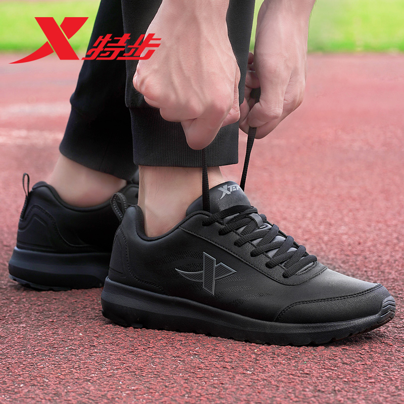 皮面防水运动鞋 子中年爸爸跑步鞋 男士 黑色防滑鞋 秋冬新款 特步男鞋