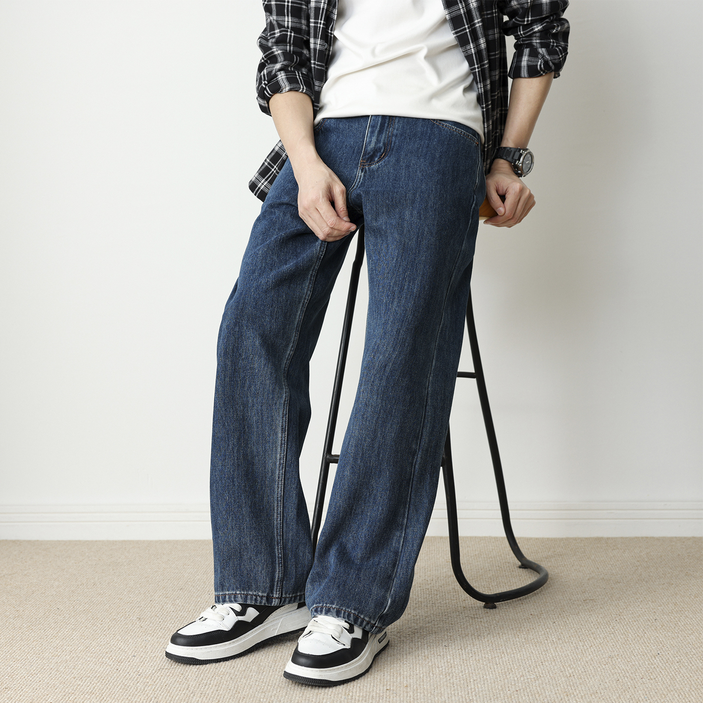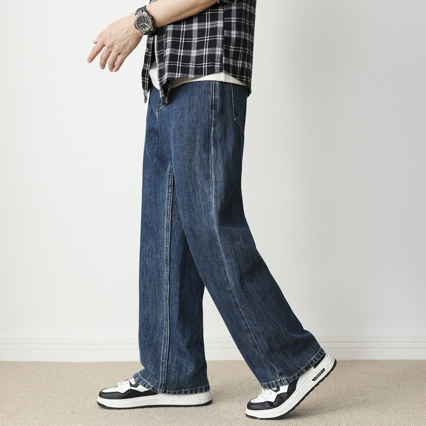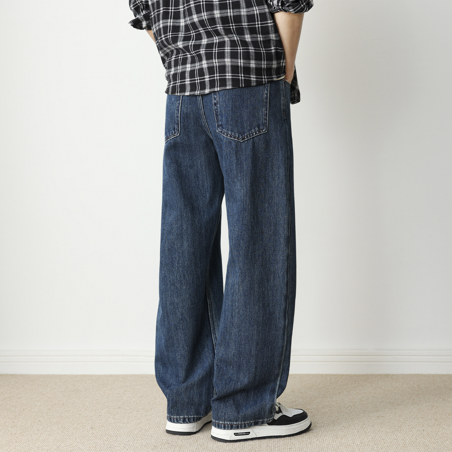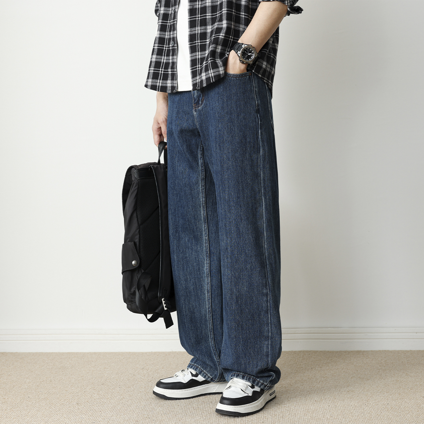 复古青少年休闲裤 美式 男2025秋季 hansca直筒阔腿宽松深蓝色牛仔裤