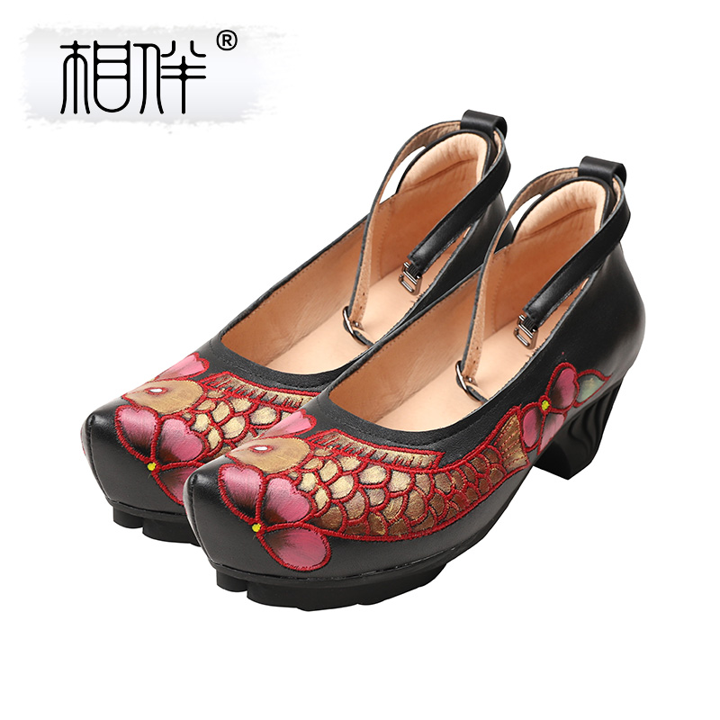 粗跟复古中国风手工原创刺绣国风女鞋 相伴真皮翘头女单鞋 2025新款