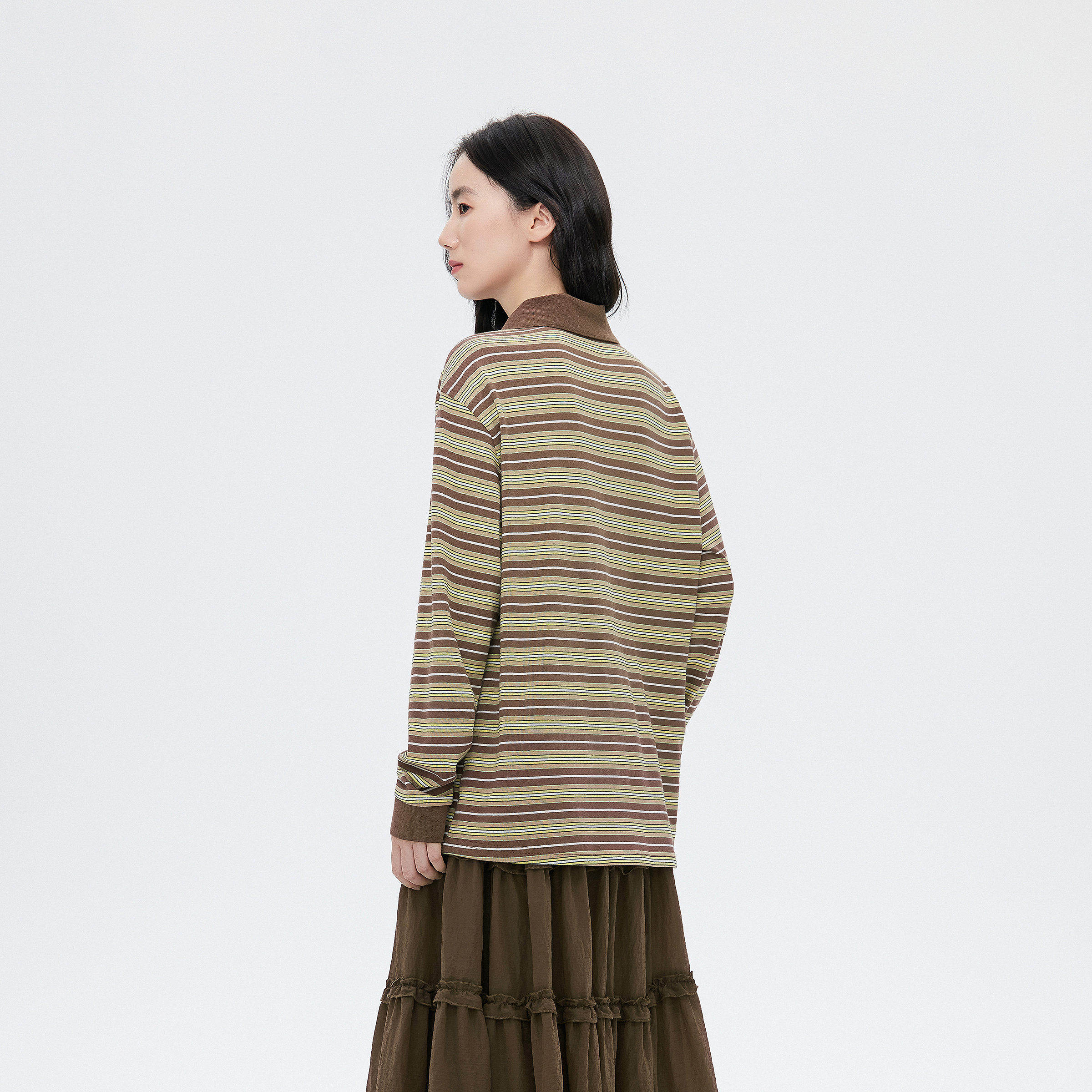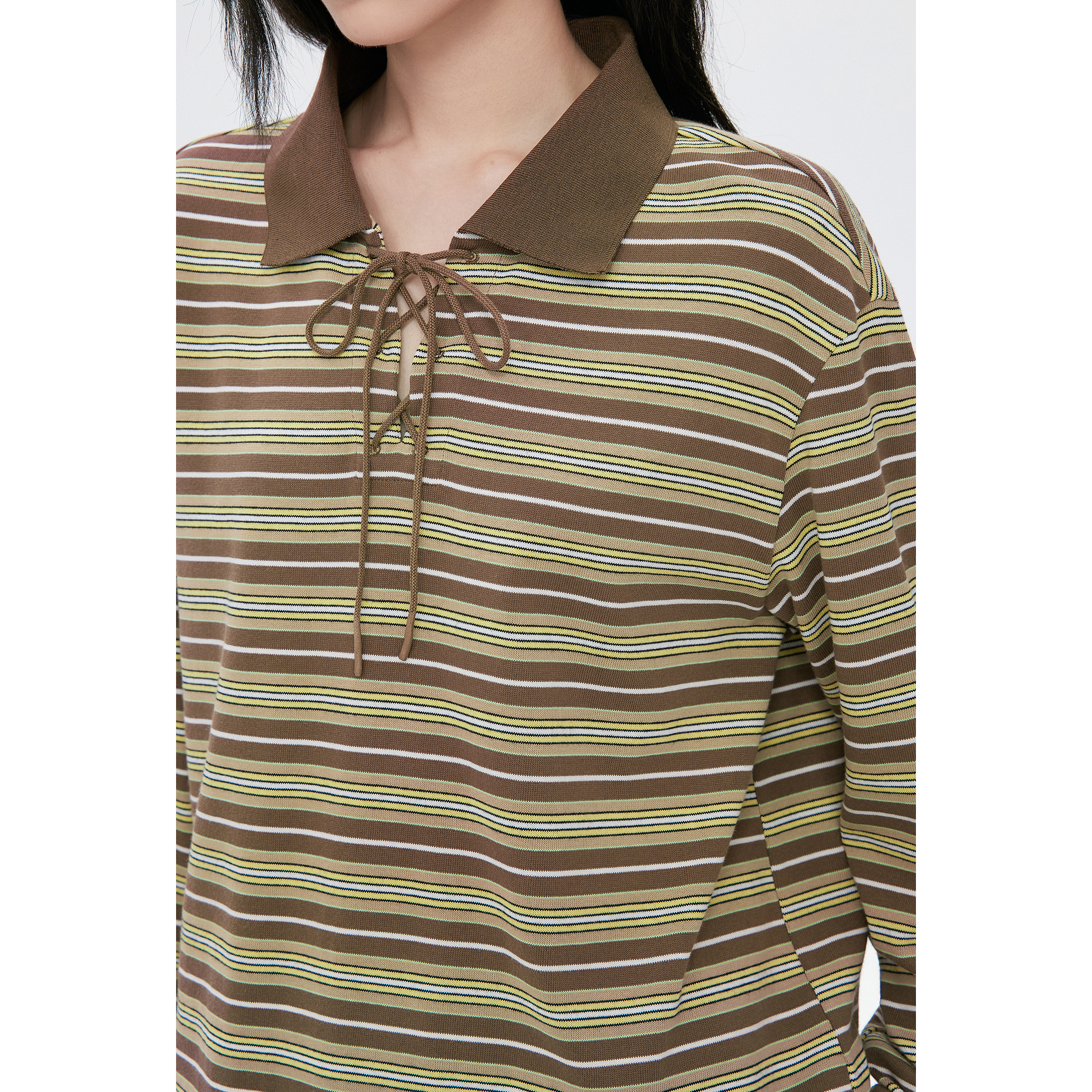 复古休闲上衣 新款 飞鸟和新酒POLO领长袖 条纹T恤女宽松2025秋季
