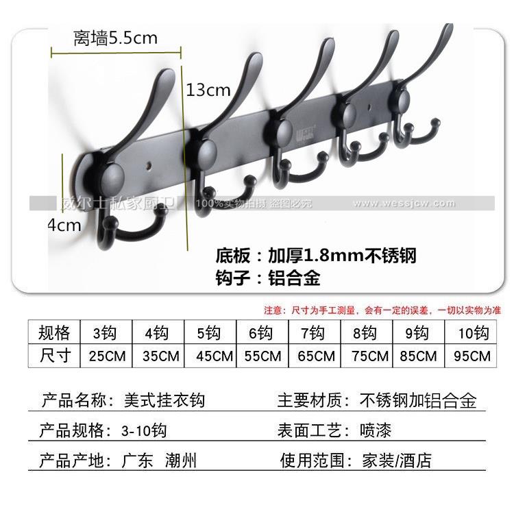 免打孔不锈钢美式 挂衣钩黑色排钩卧室门后挂钩挂衣架衣帽钩壁挂