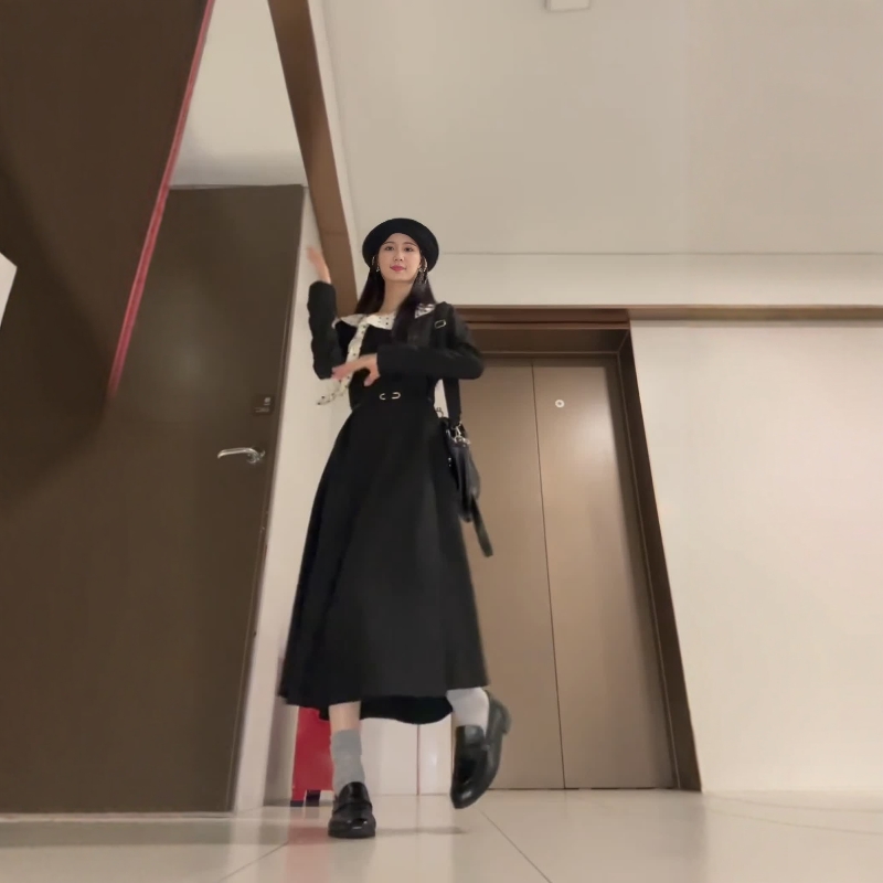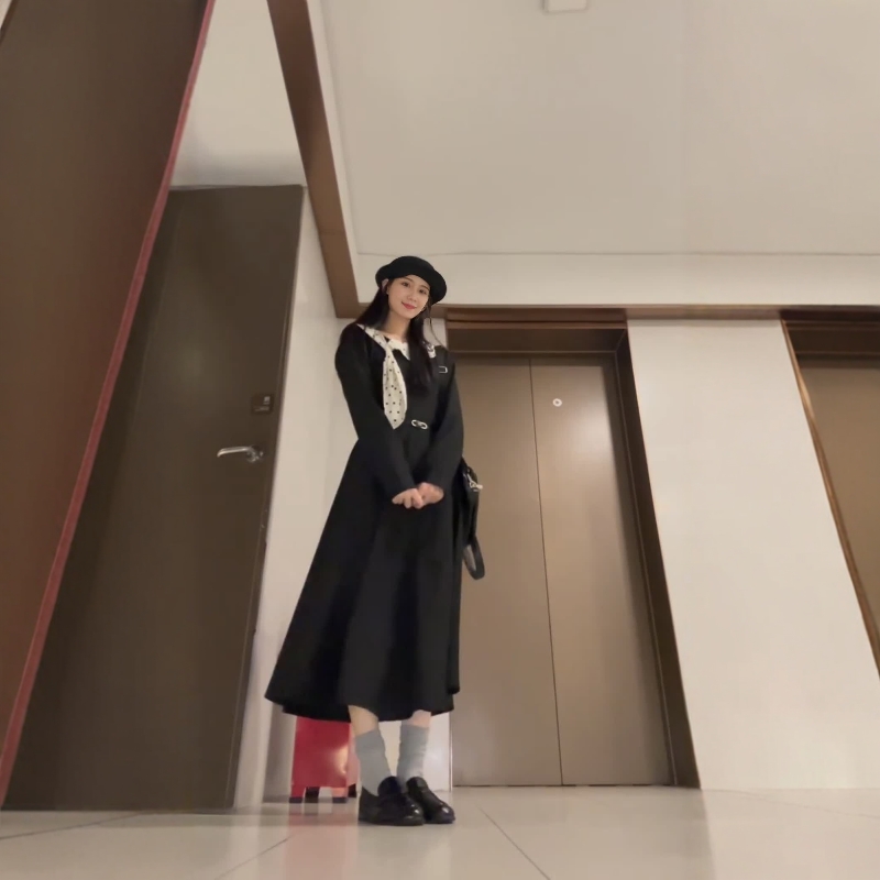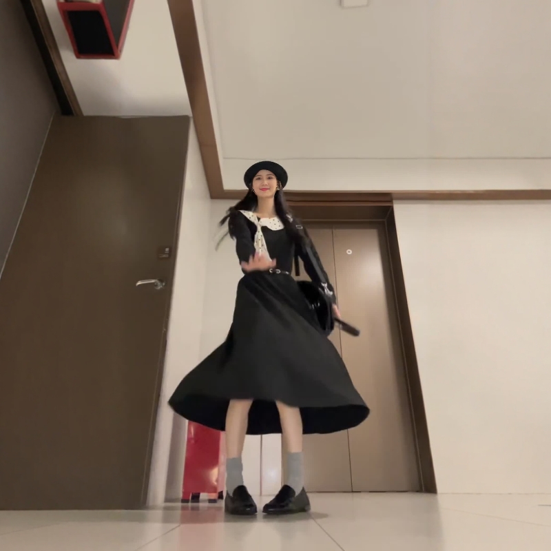 连衣裙 设计感辣妹小黑裙气质喇叭袖 法式 拼接波点系带长裙女秋冬季